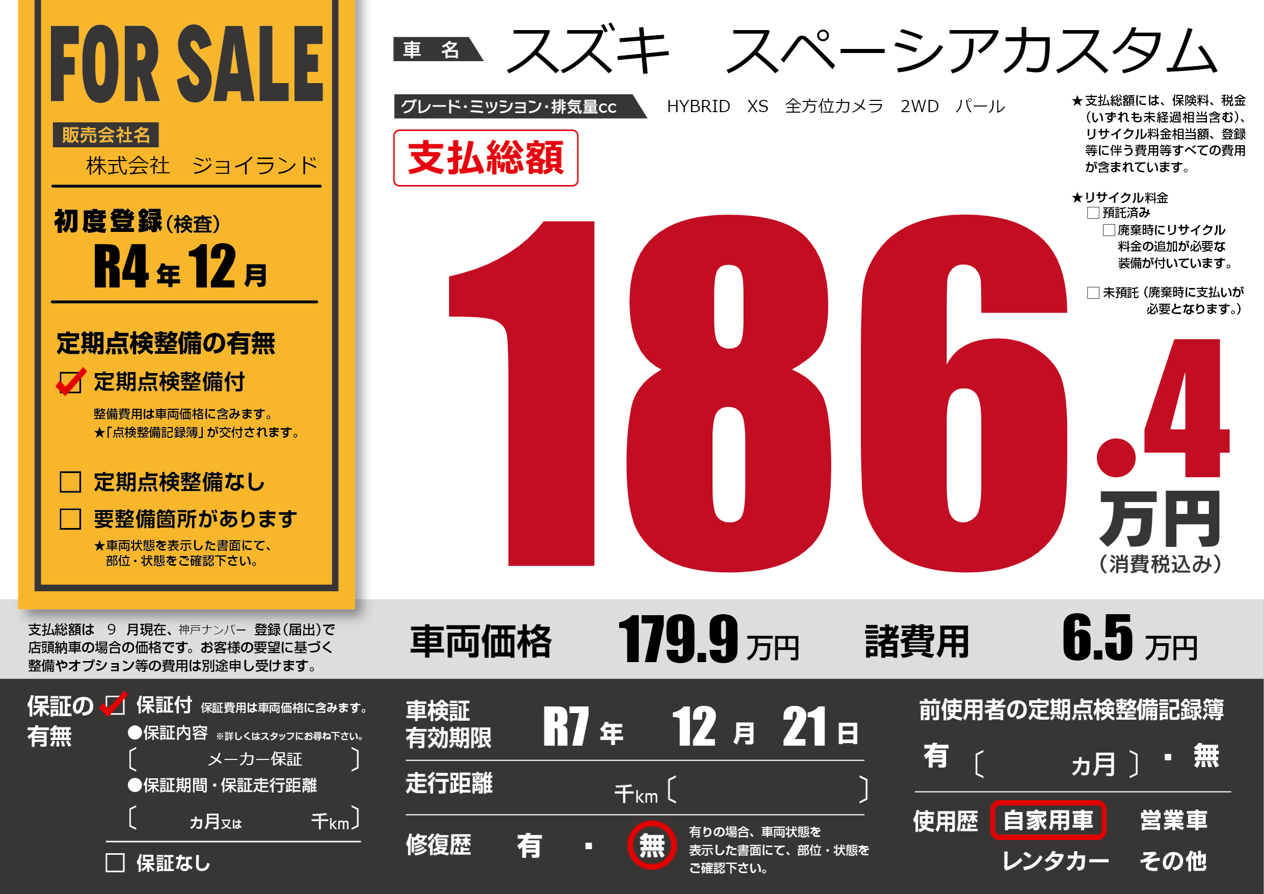 保証付き 保証内容( メーカー保証) ---ヶ月または()千kmまで |