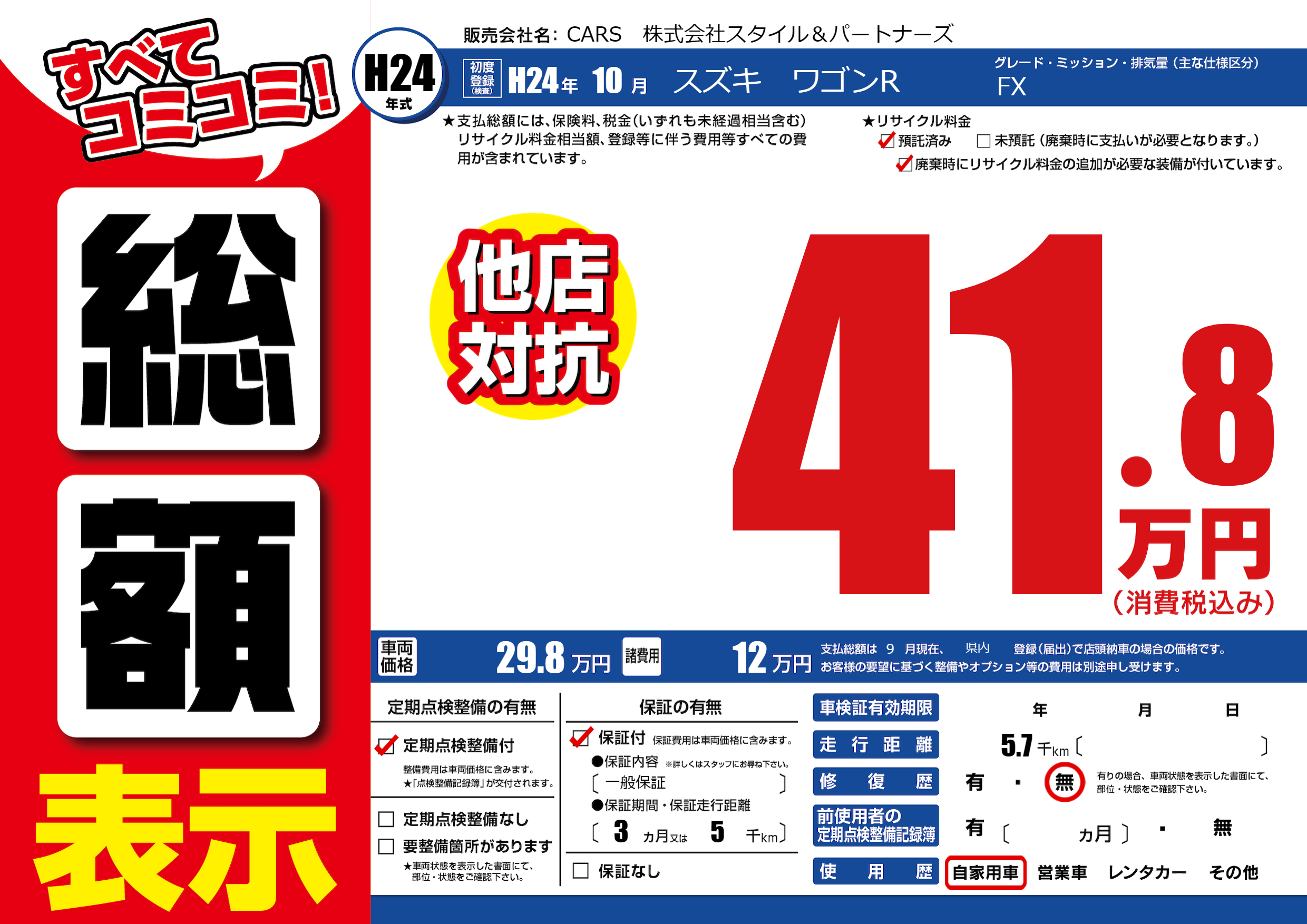 | 車名 | スズキ ワゴンR | グレード ミッション 排気量 |