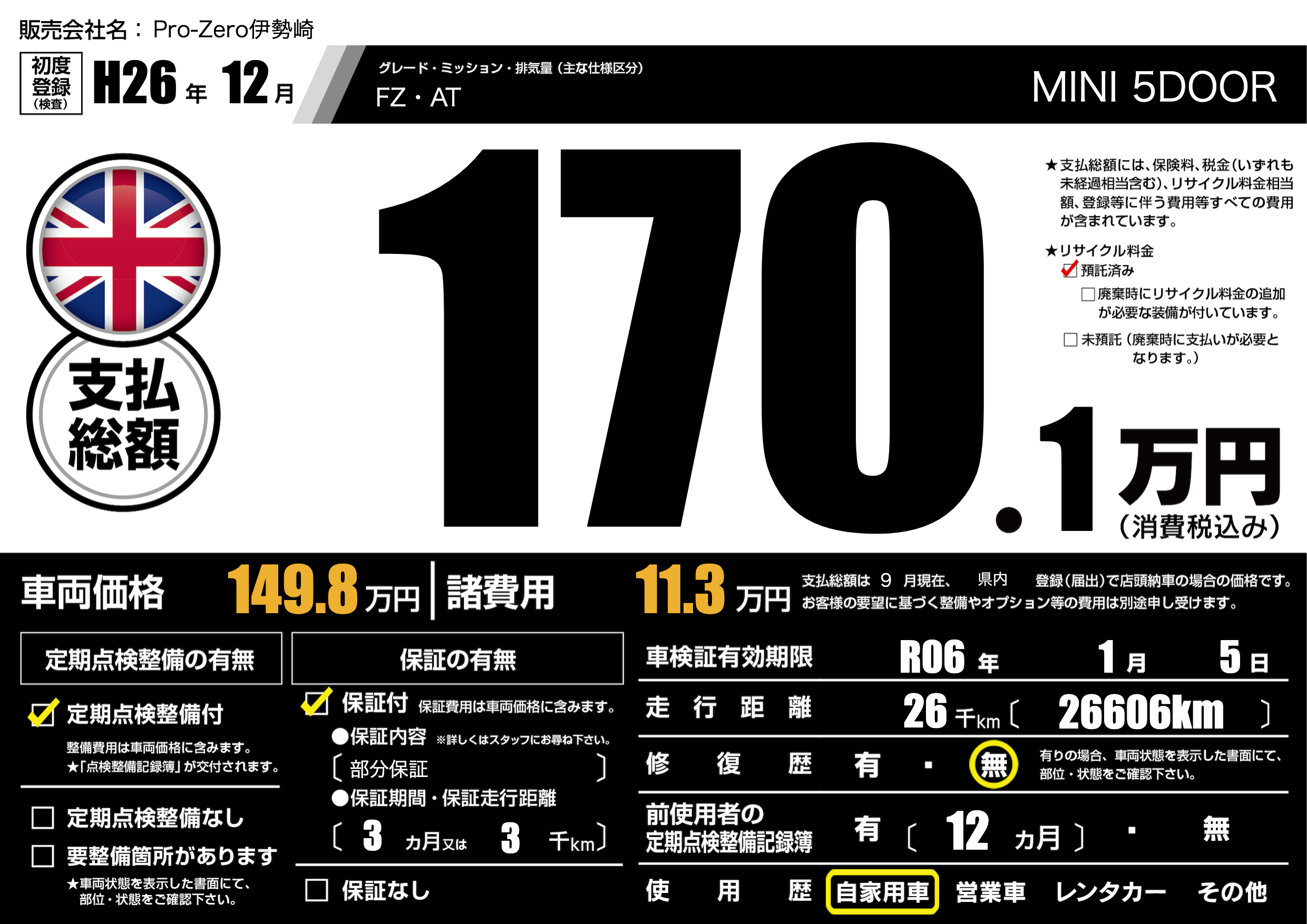 | 車名 | MINI 5DOOR | グレード ミッション 排気量 |