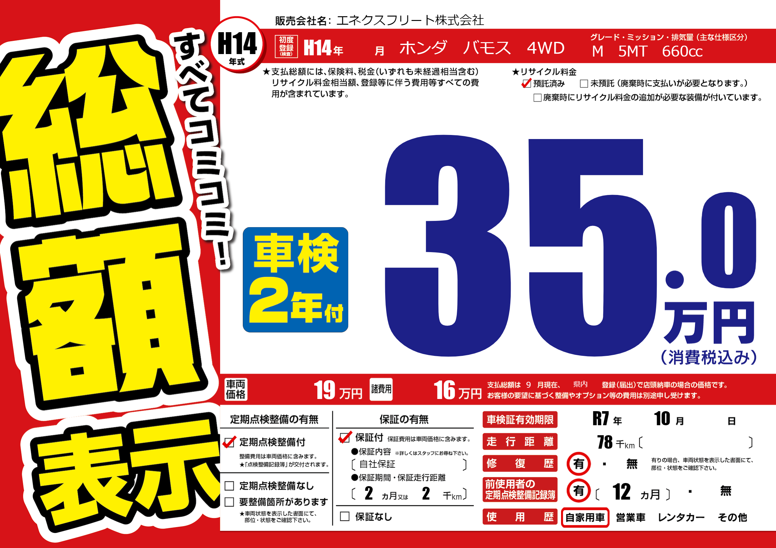 | 車名 | ホンダ バモス 4WD | グレード ミッション 排気量 |