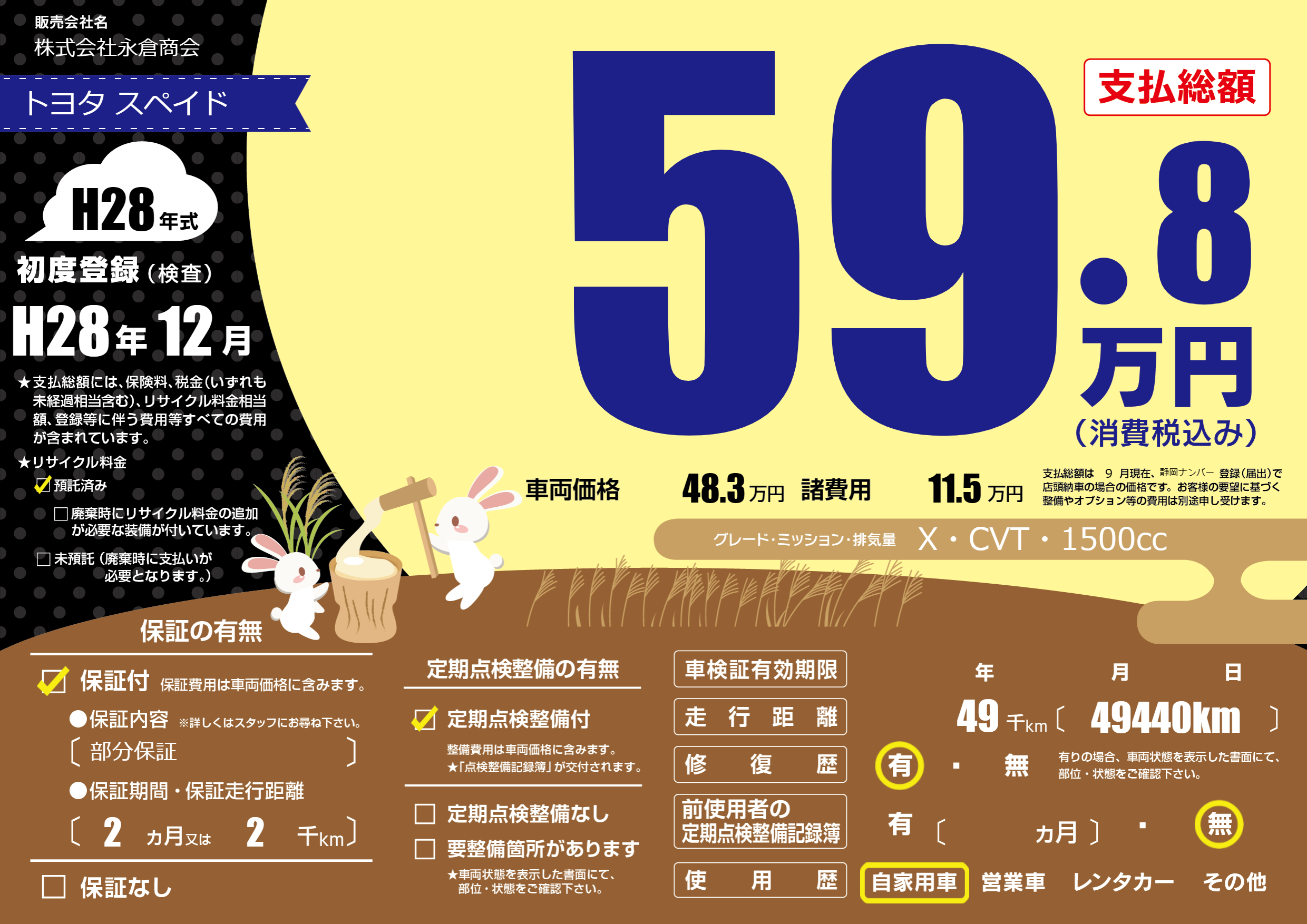 | 車名 | トヨタ スペイド | グレード ミッション 排気量 |