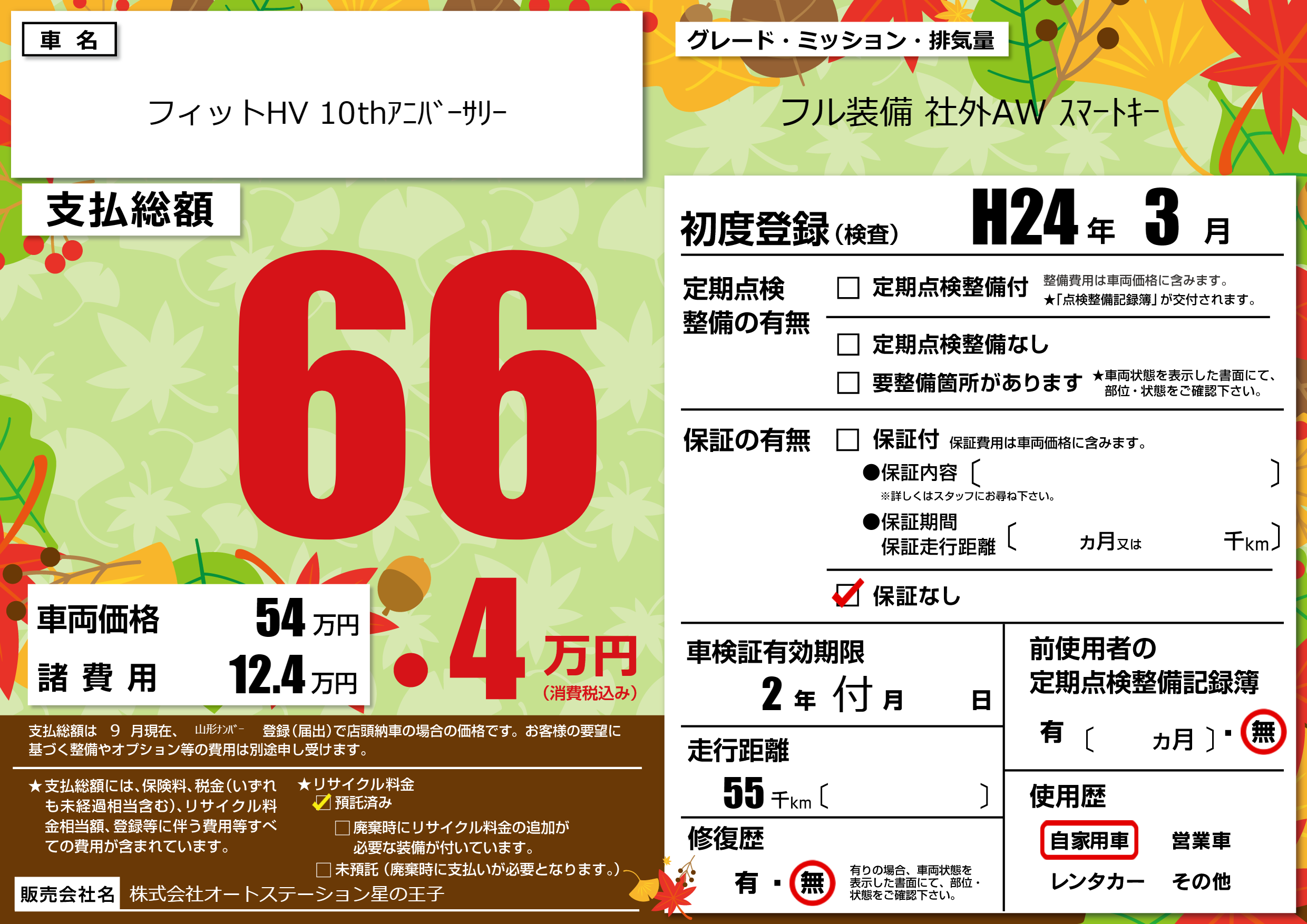 | 車名 | フィットHV 10thアニバーサリー | グレード ミッション 排気量 |