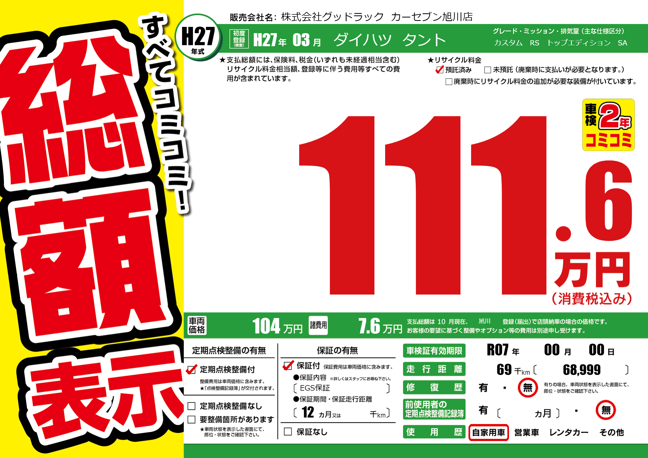 | 車名 | ダイハツ タント | グレード ミッション 排気量 |