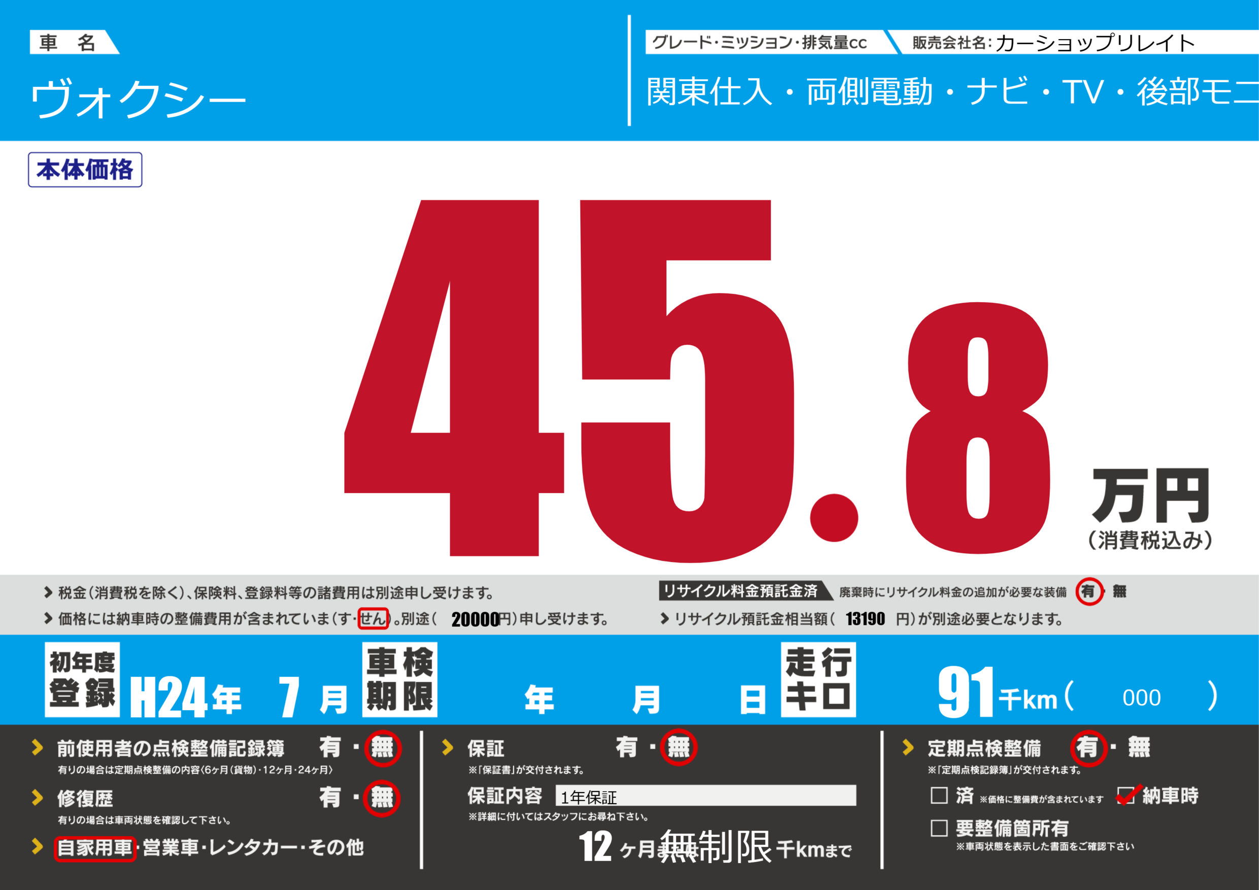 | 走行キロ | 9.1万km | 初年度登録 | H24年7月 |