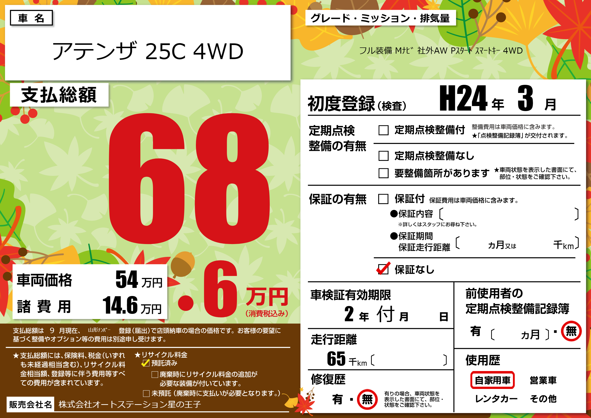 | 車名 | アテンザ 25C 4WD | グレード ミッション 排気量 |