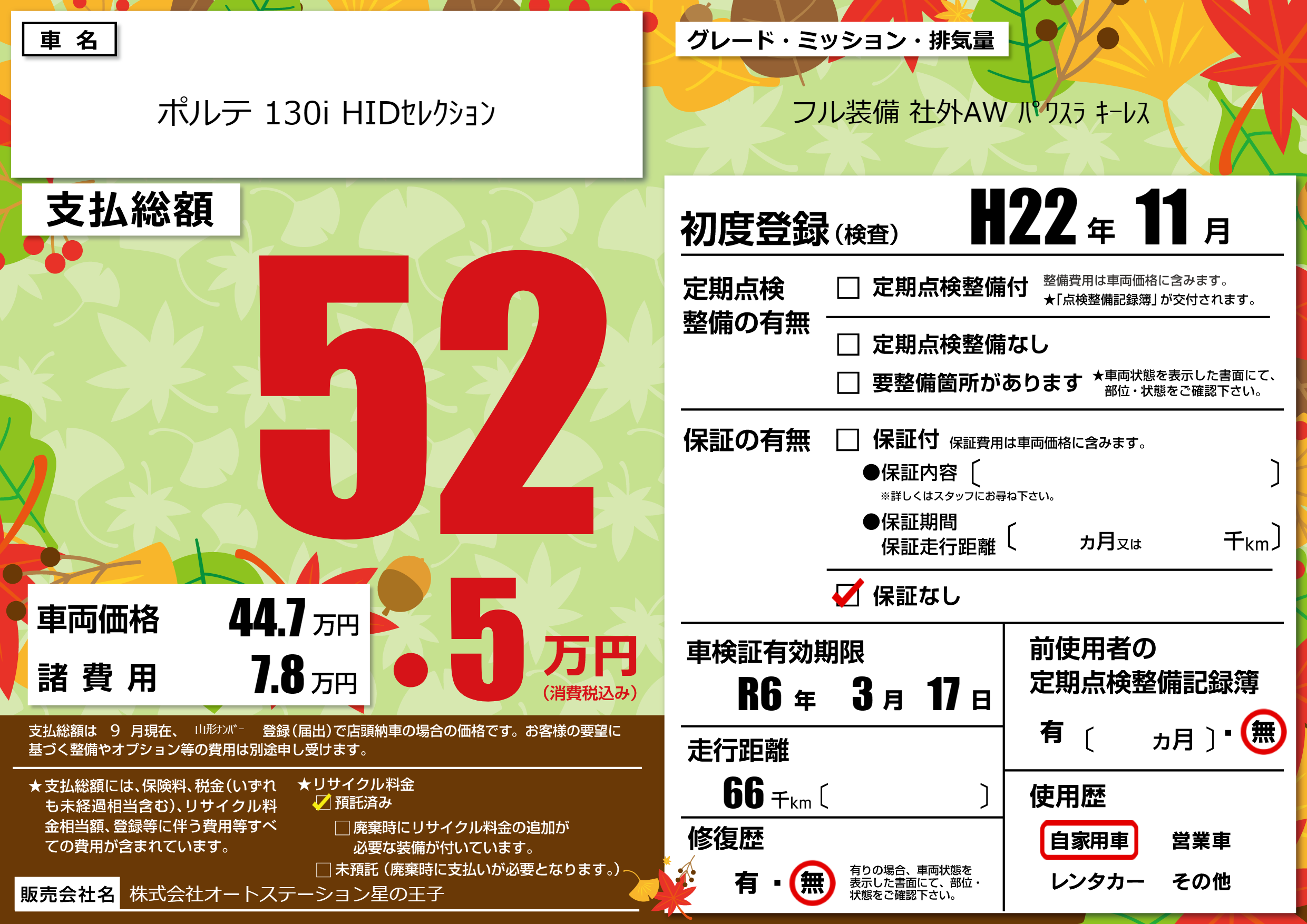 | 車名 | ポルテ 130i HIDセレクション | グレード ミッション 排気量 |