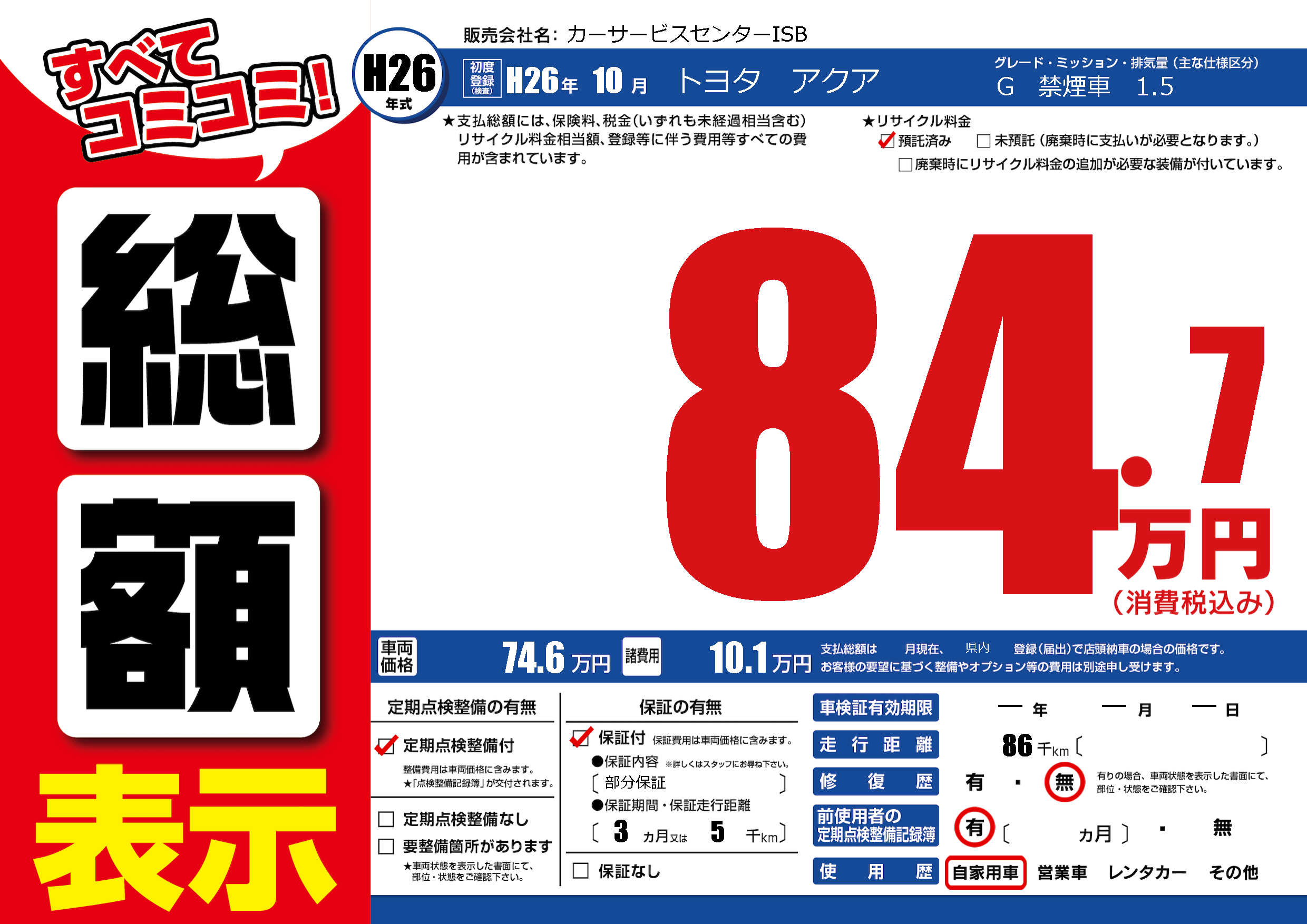 | 車名 | トヨタ アクア | グレード ミッション 排気量 |