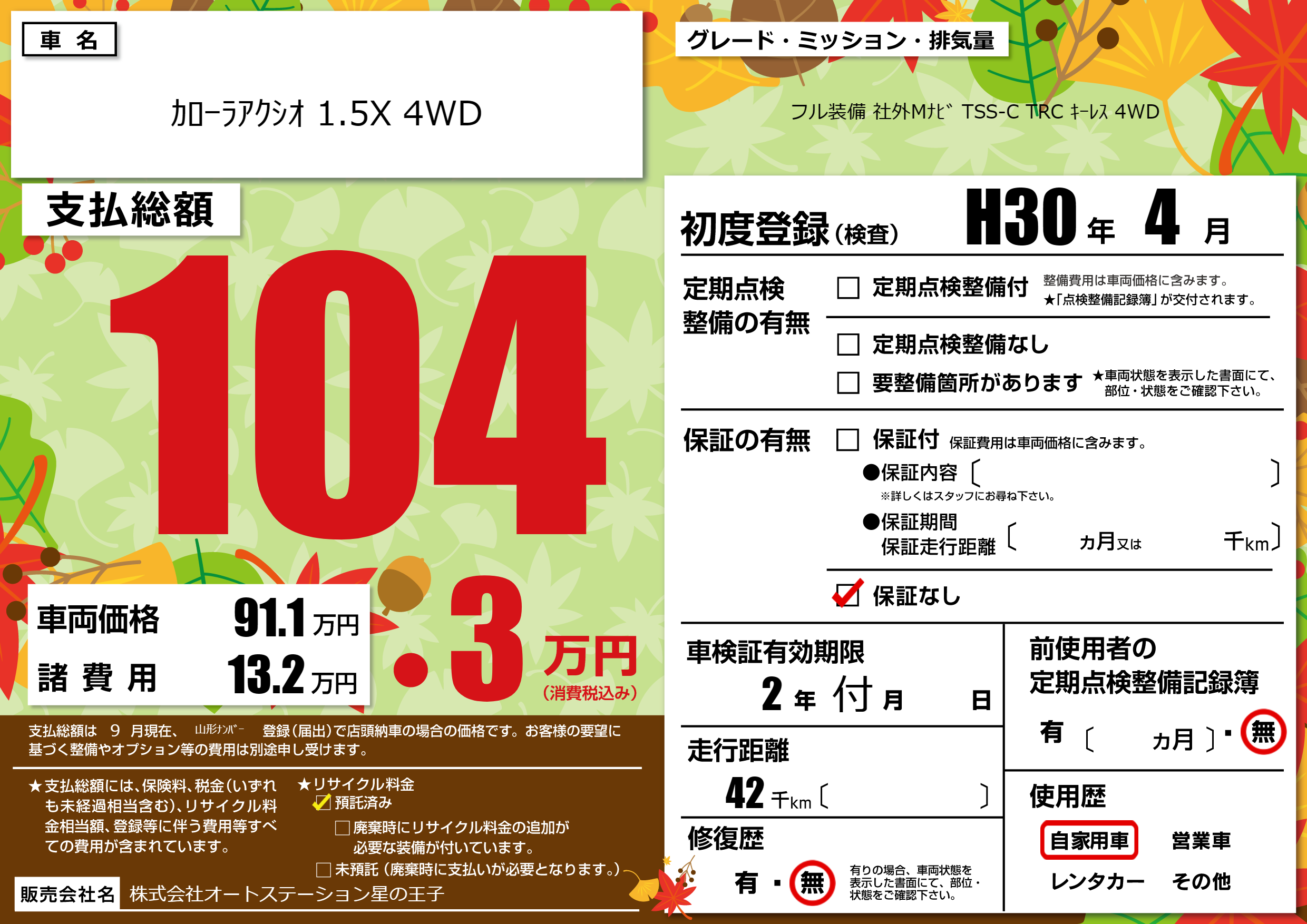 | 車名 | カローラアクシオ 1.5X 4WD | グレード ミッション 排気量 |