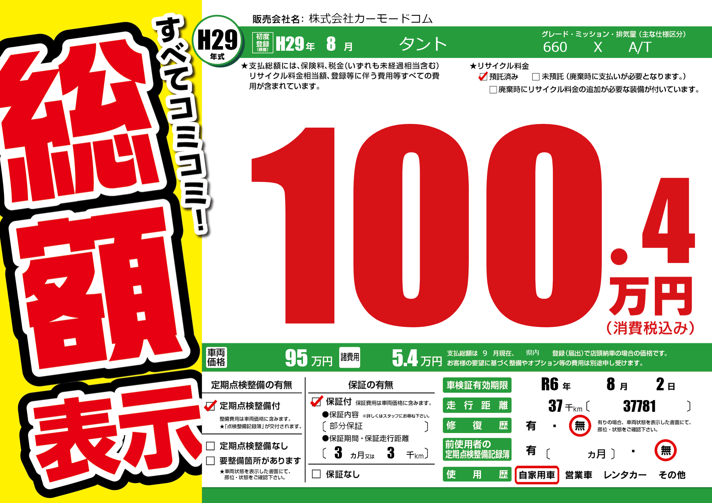 保証付き 保証内容(部分保証) 3ヶ月または(3)千kmまで |
