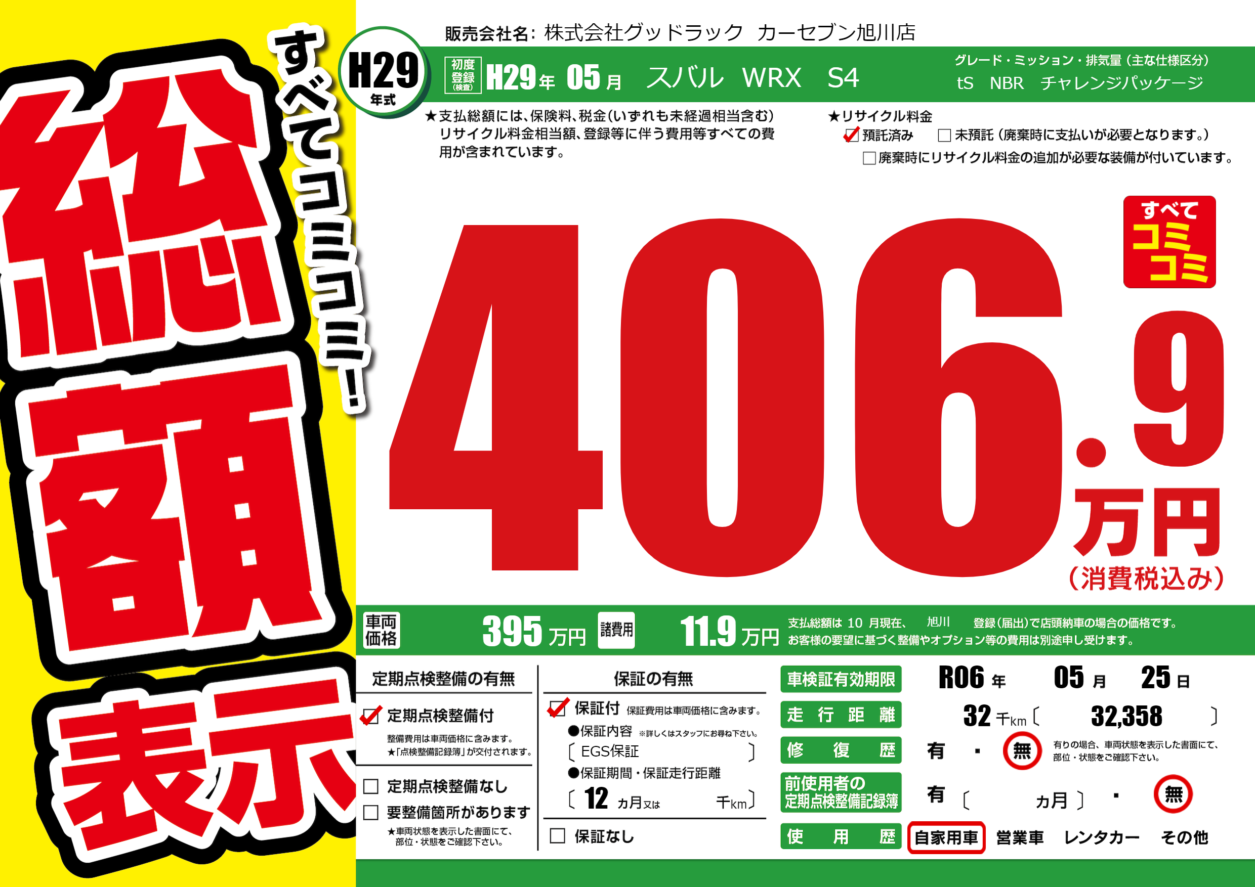 | 車名 | スバル WRX S4 | グレード ミッション 排気量 |