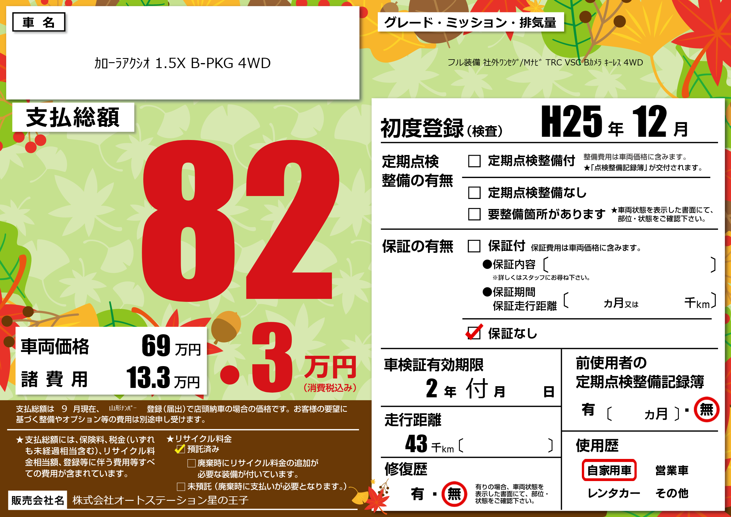 | 車名 | カローラアクシオ 1.5X B-PKG 4WD | グレード ミッション 排気量 |