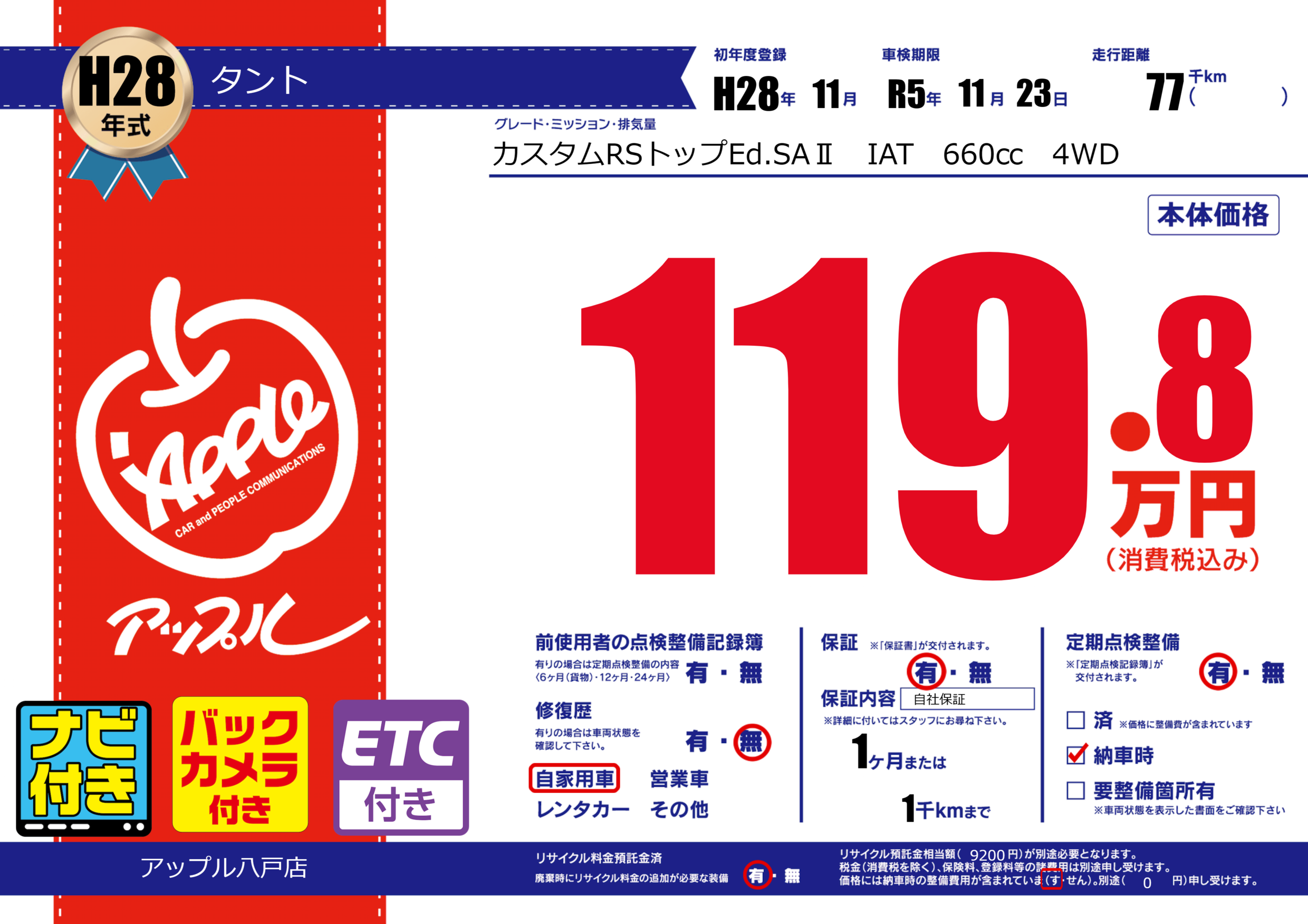 | 走行キロ | 7.7万km | 初年度登録 | H28年11月 |