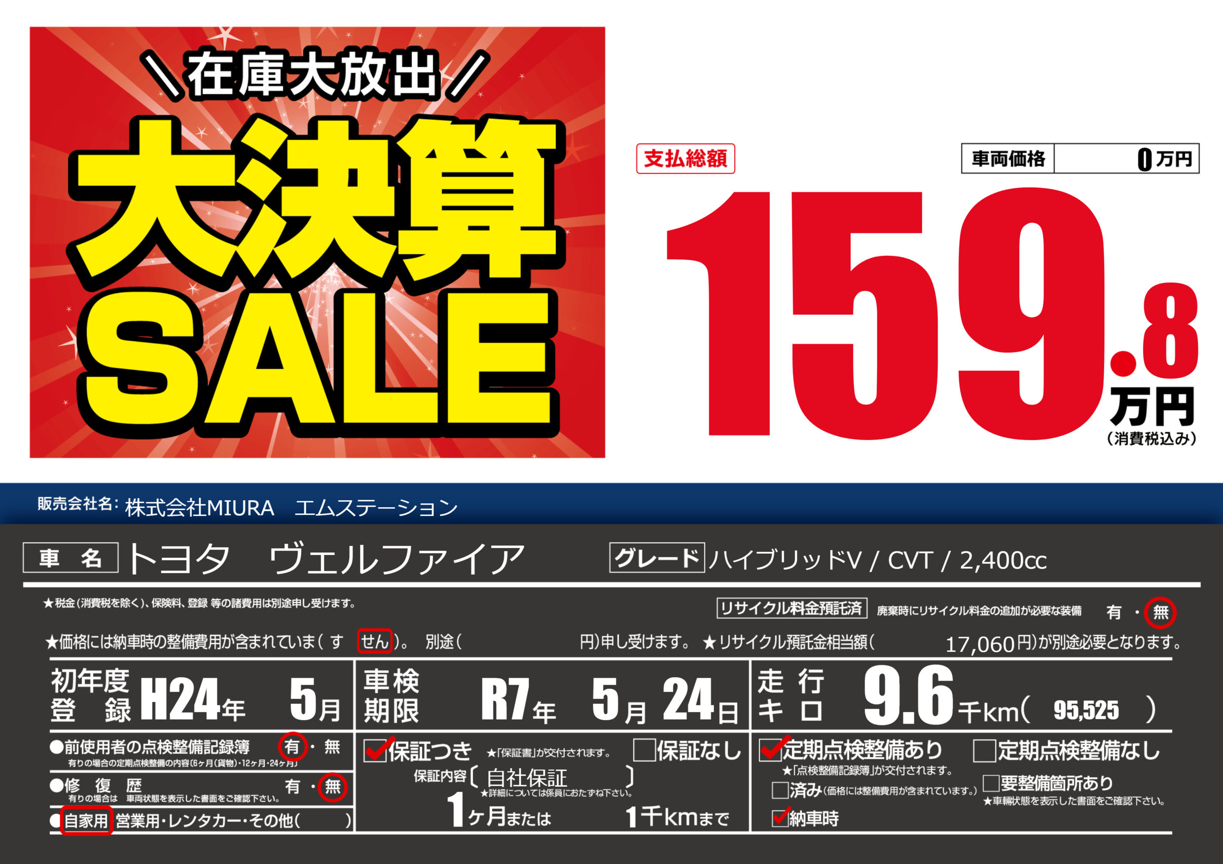 | 車名 | トヨタ ヴェルファイア | グレード ミッション 排気量 |