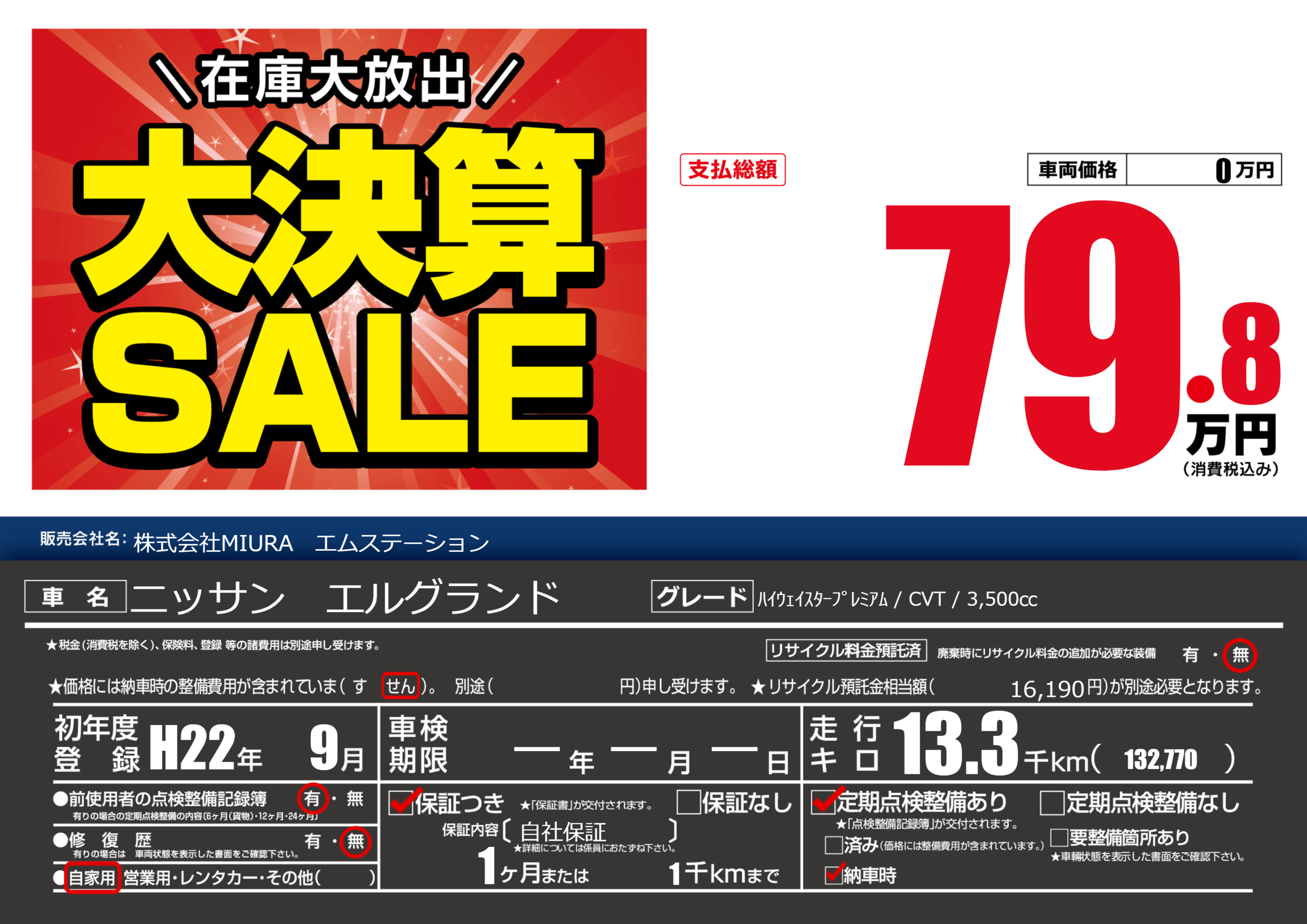 | 車名 | ニッサン エルグランド | グレード ミッション 排気量 |