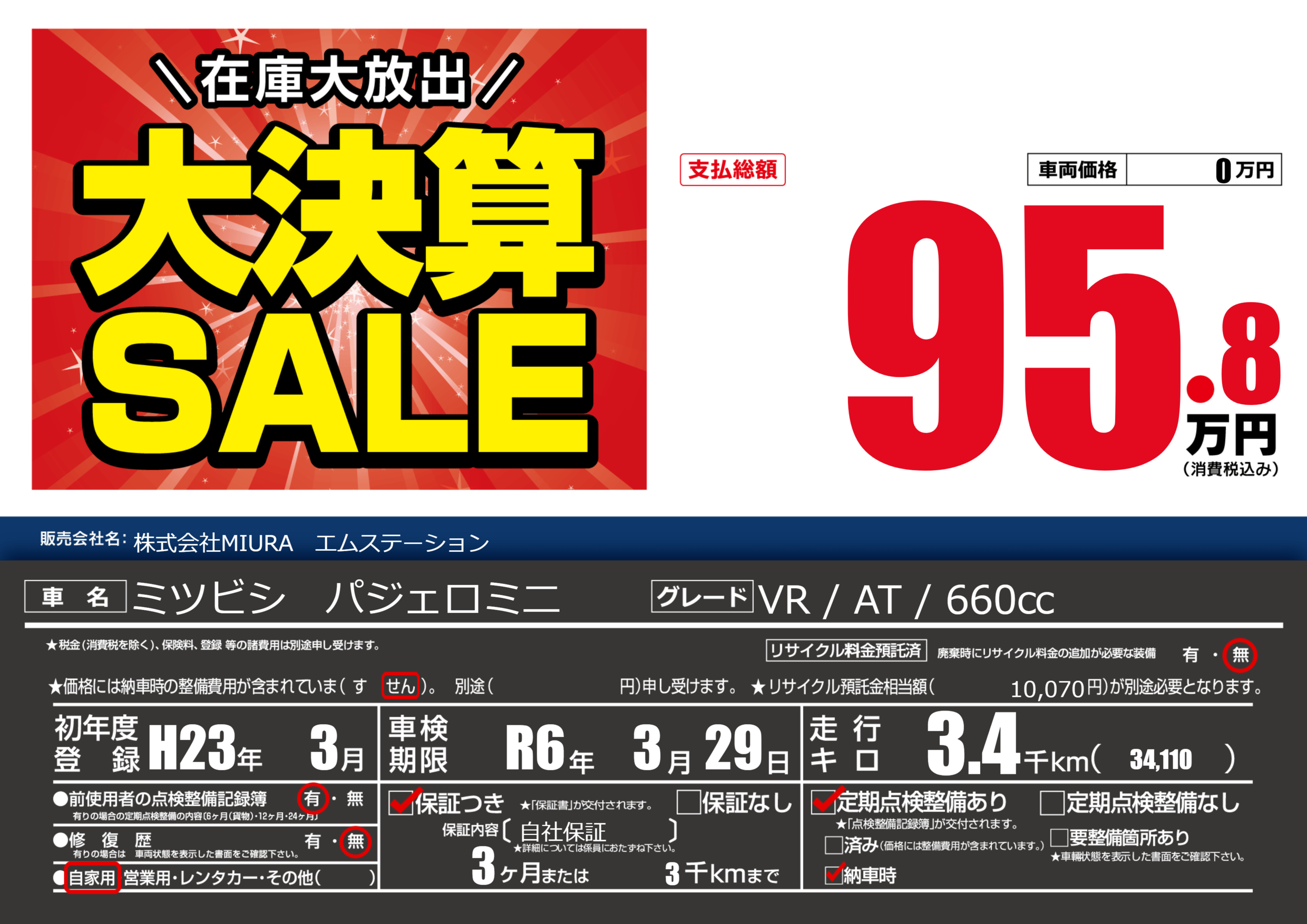 保証付き 保証内容(自社保証) 3ヶ月または(3)千kmまで |