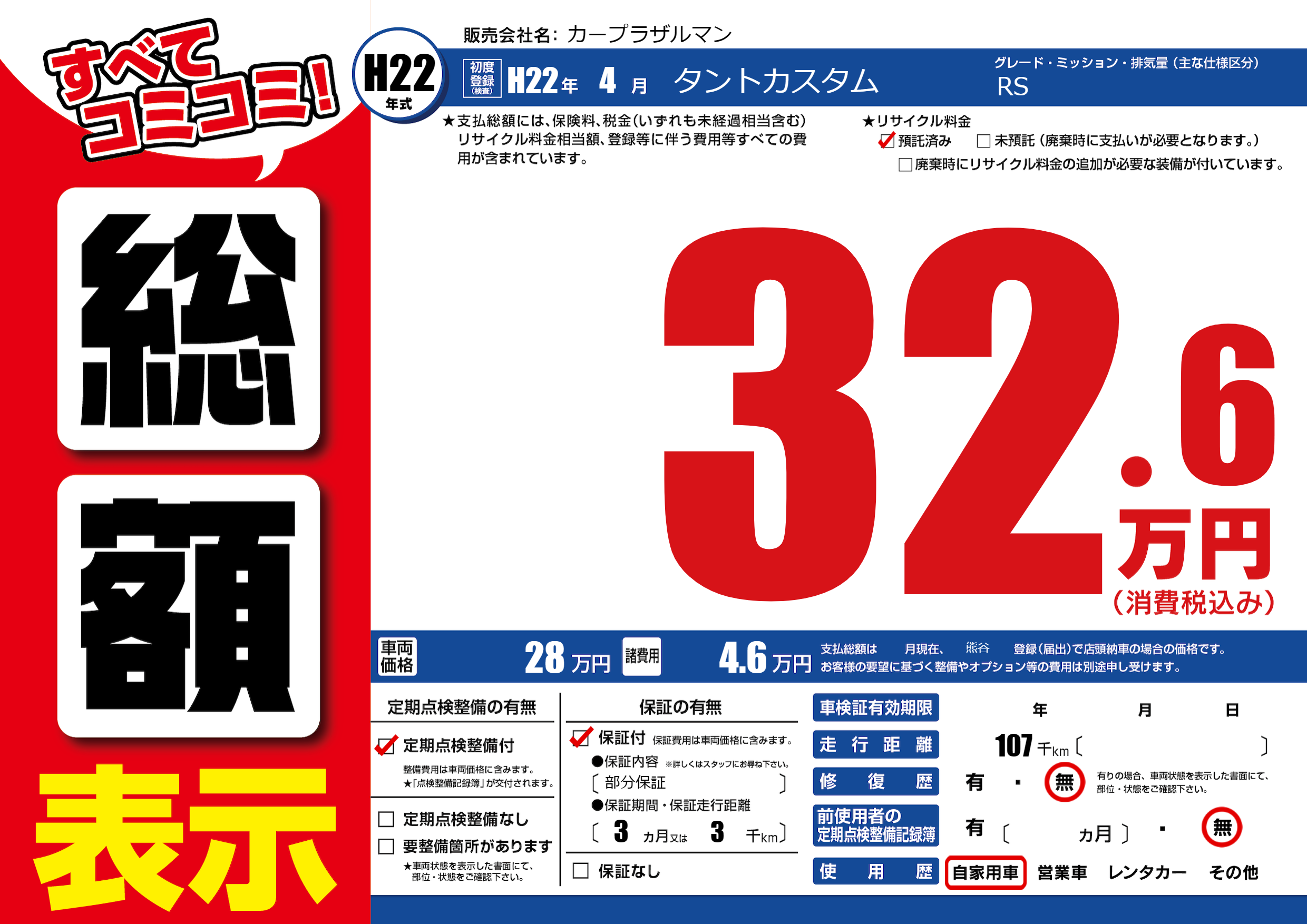| 車名 | タントカスタム | グレード ミッション 排気量 |