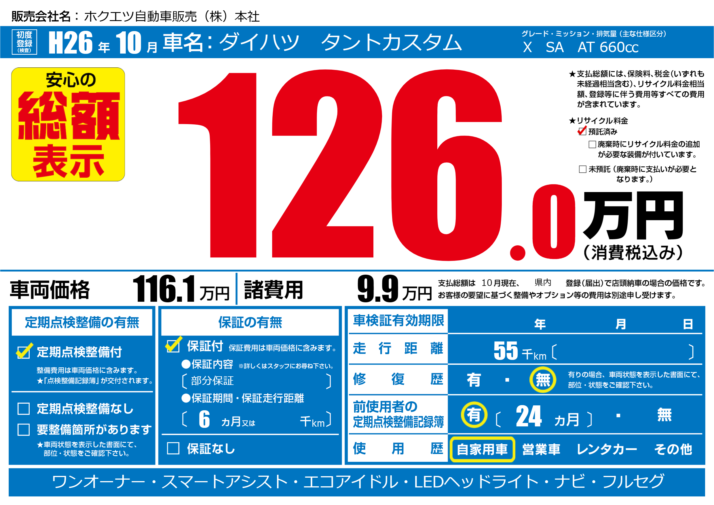 | 走行キロ | 5.5万km | 初年度登録 | H26年10月 |