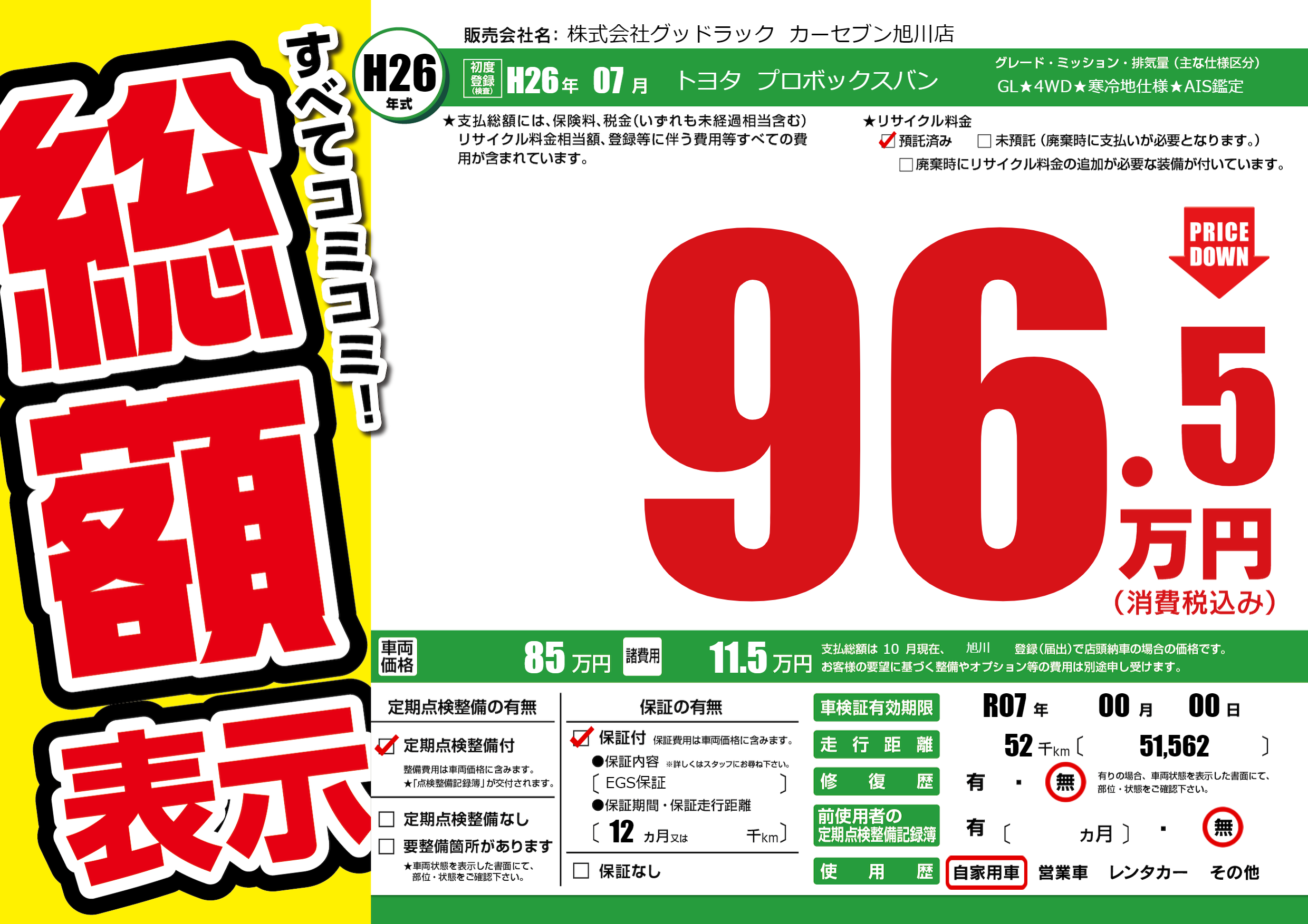 | 車名 | トヨタ プロボックスバン | グレード ミッション 排気量 |