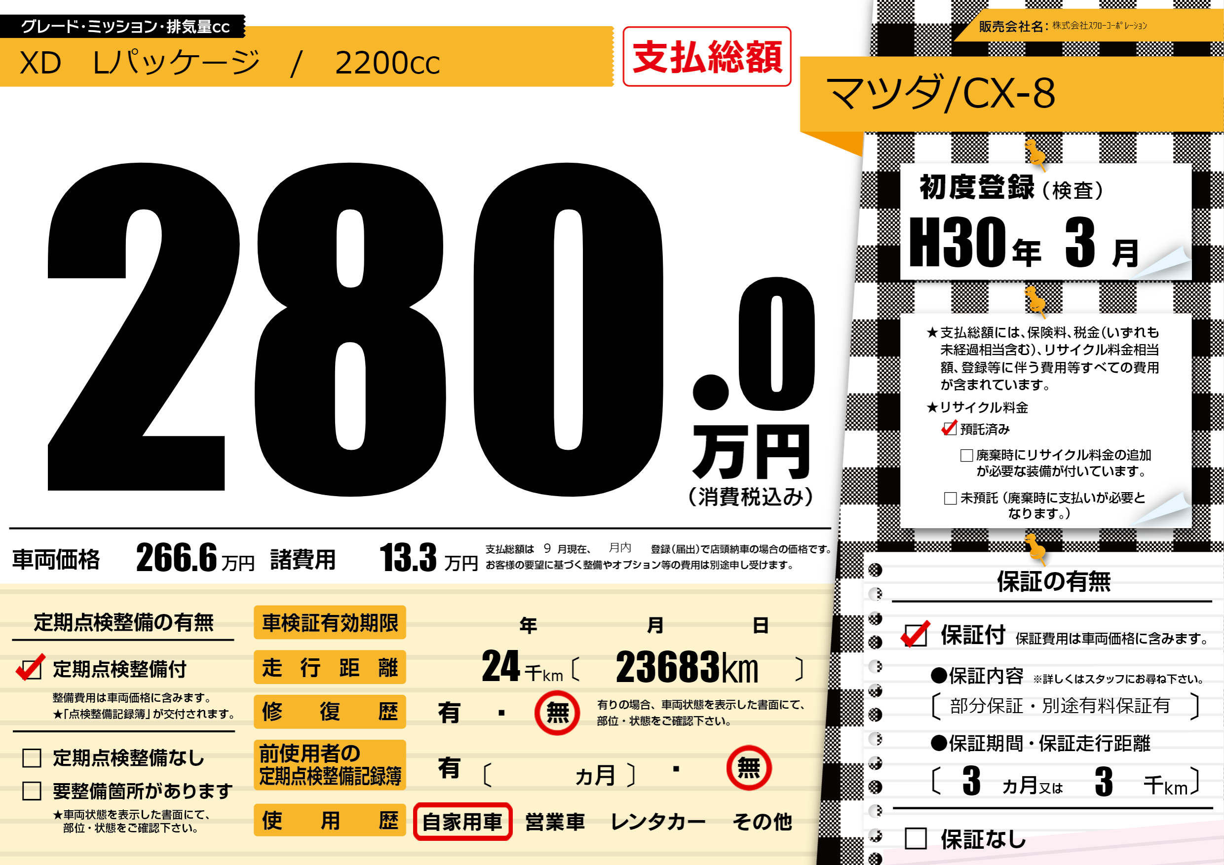 保証付き 保証内容(部分保証・別途有料保証有) 3ヶ月または(3)千kmまで |