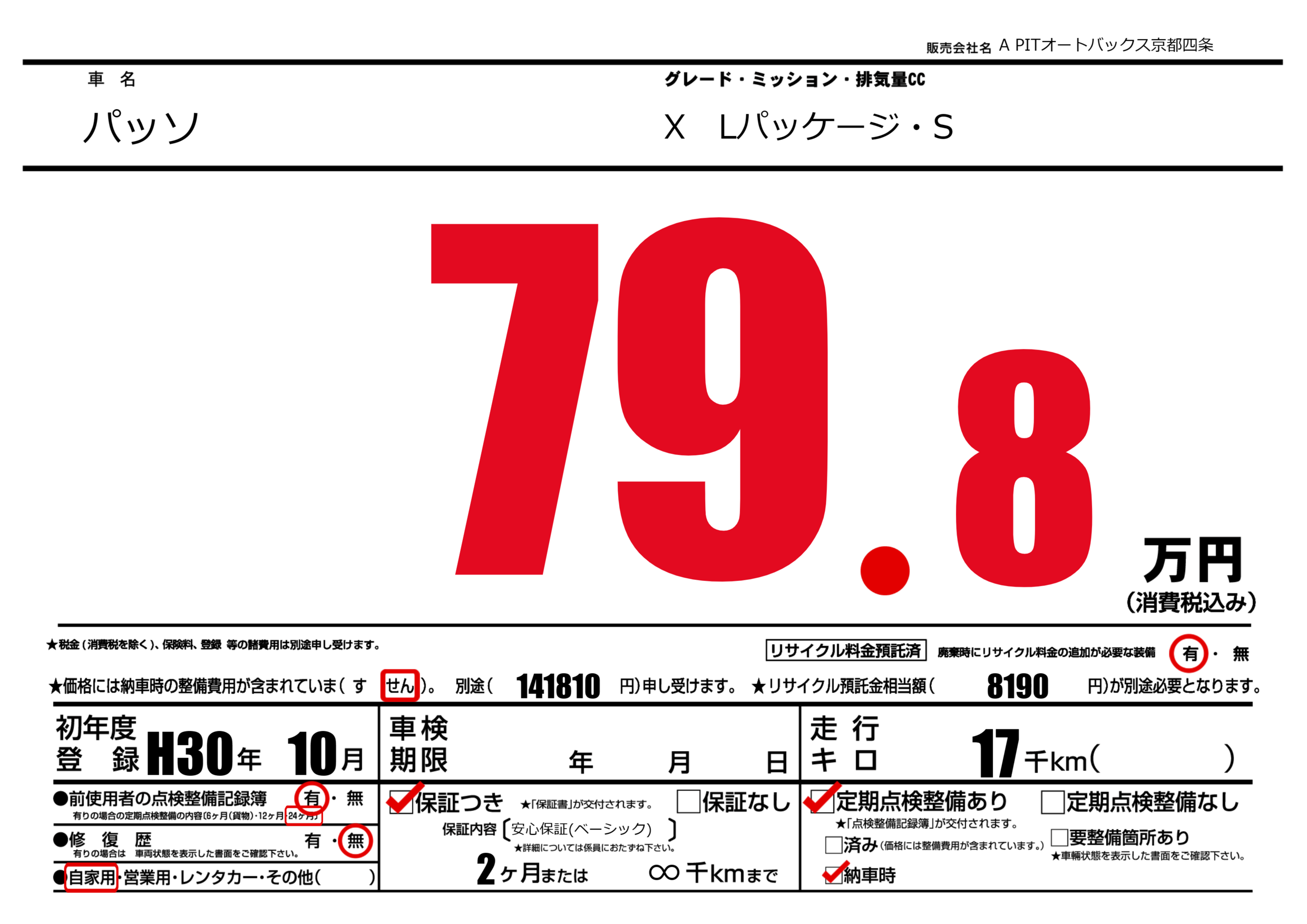 | 車名 | パッソ | グレード ミッション 排気量 |