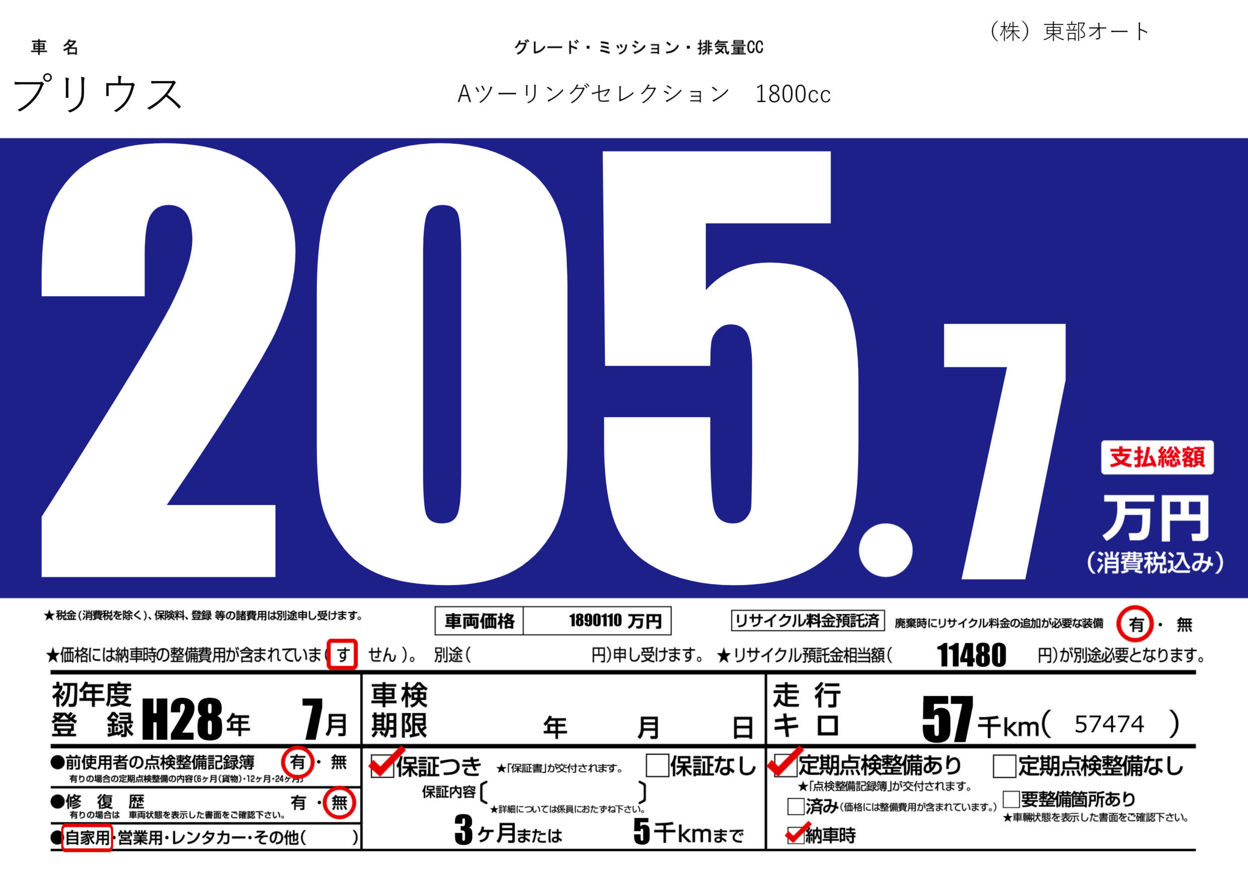 | 車名 | プリウス | グレード ミッション 排気量 |