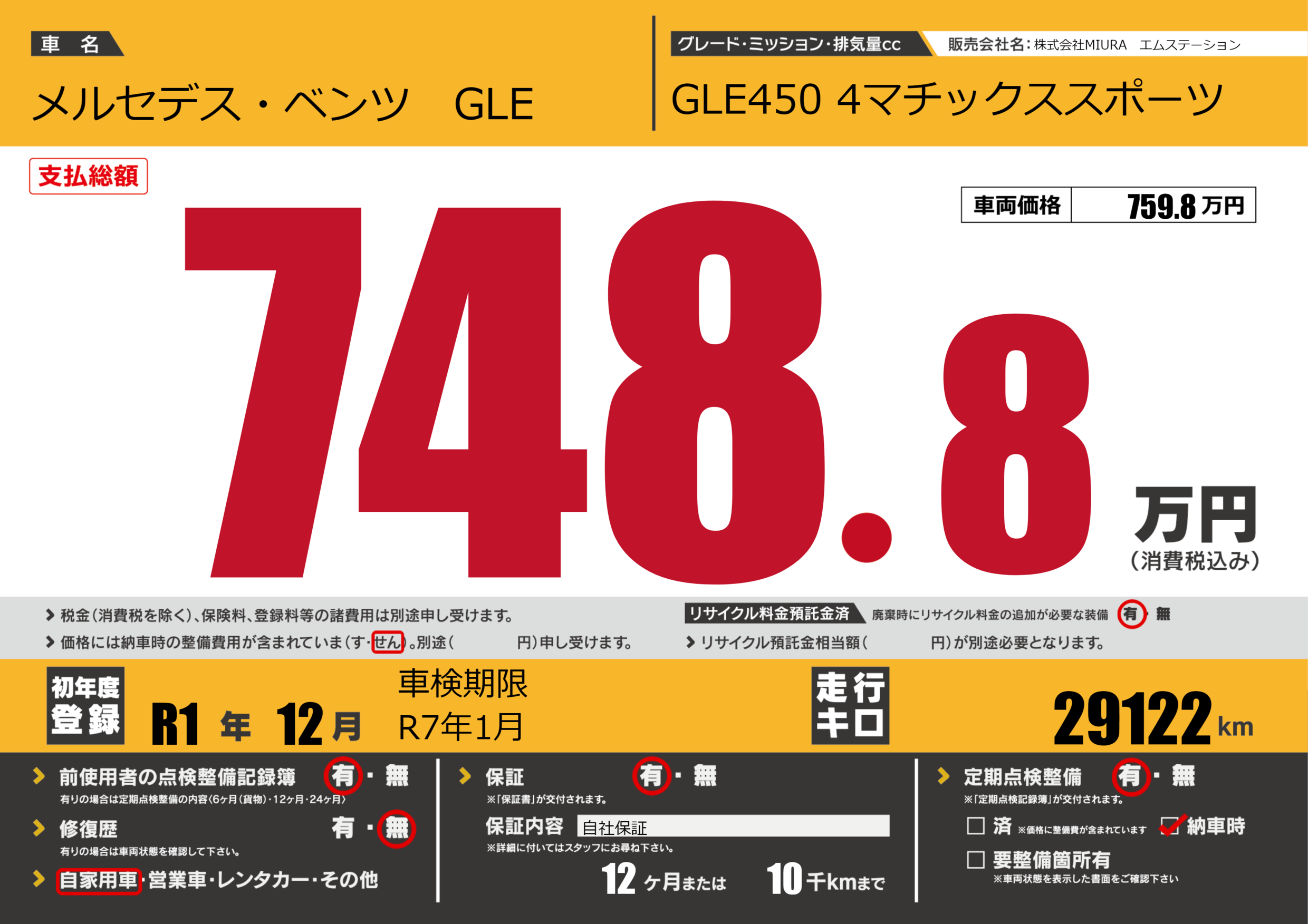 | 定期点検整備 | 定期点検整備あり 納車時あり | ||