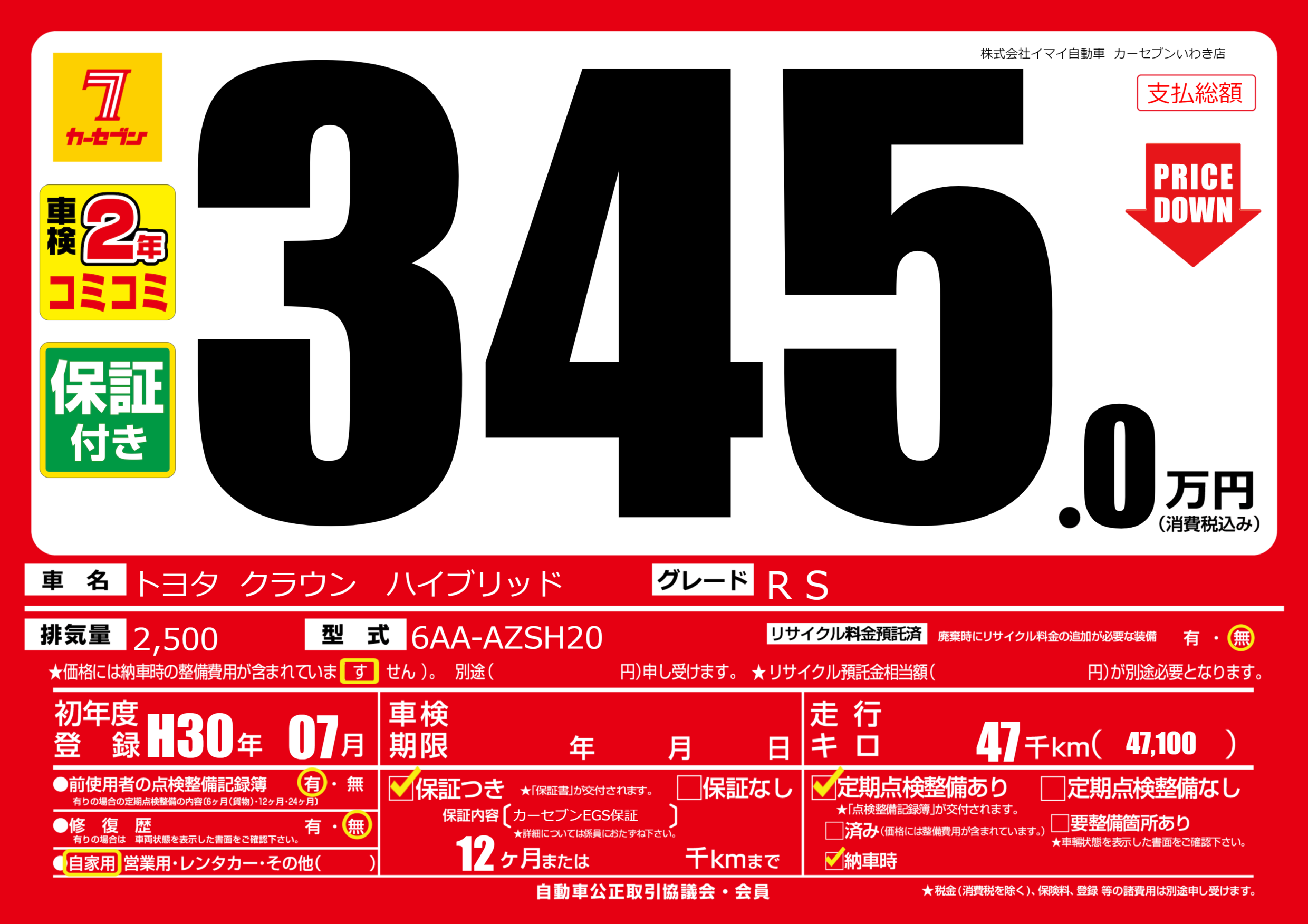 保証付き 保証内容(カーセブンEGS保証) 12ヶ月または千km |