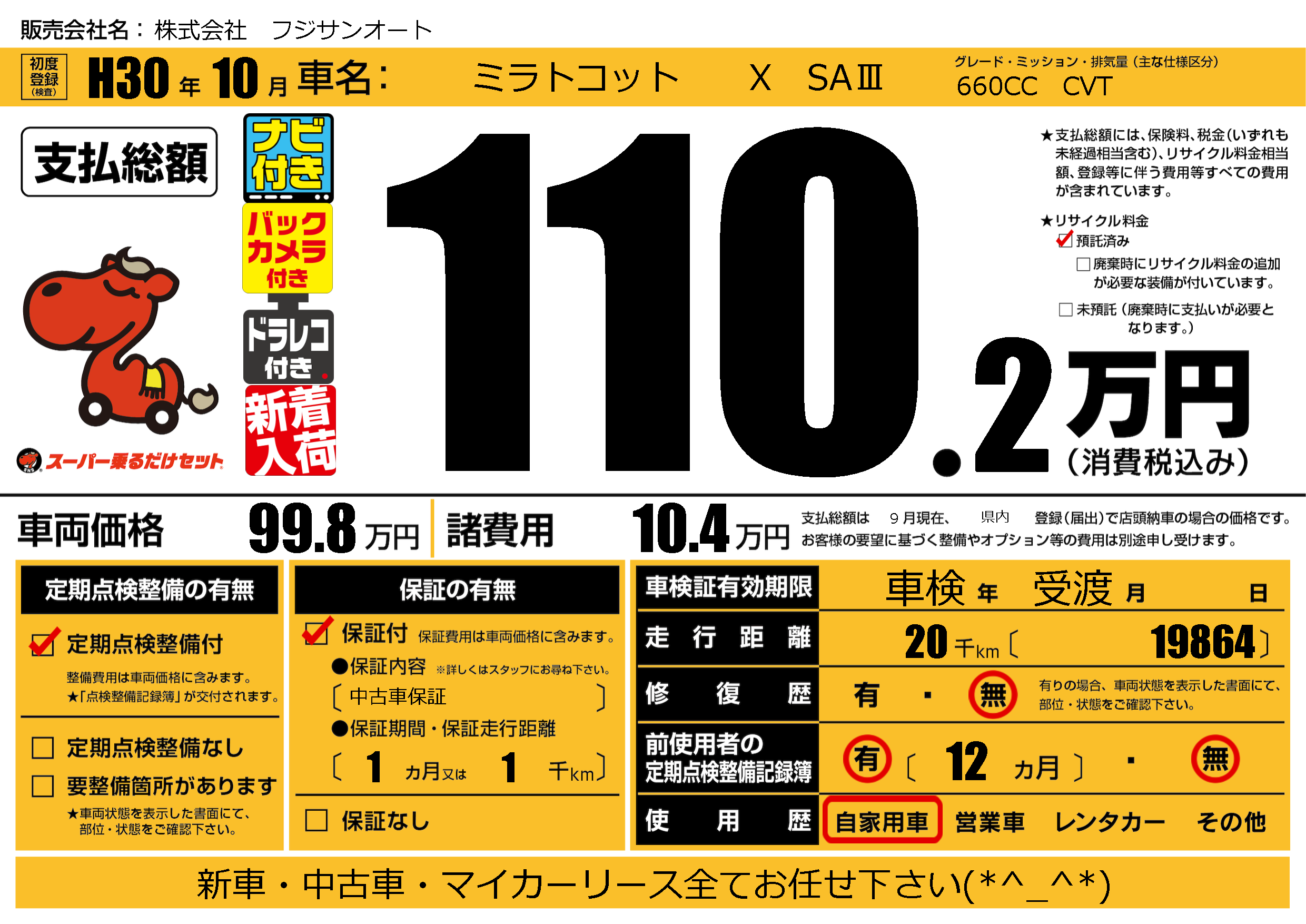 | 車名 | ミラトコット X SAⅢ | グレード ミッション 排気量 |