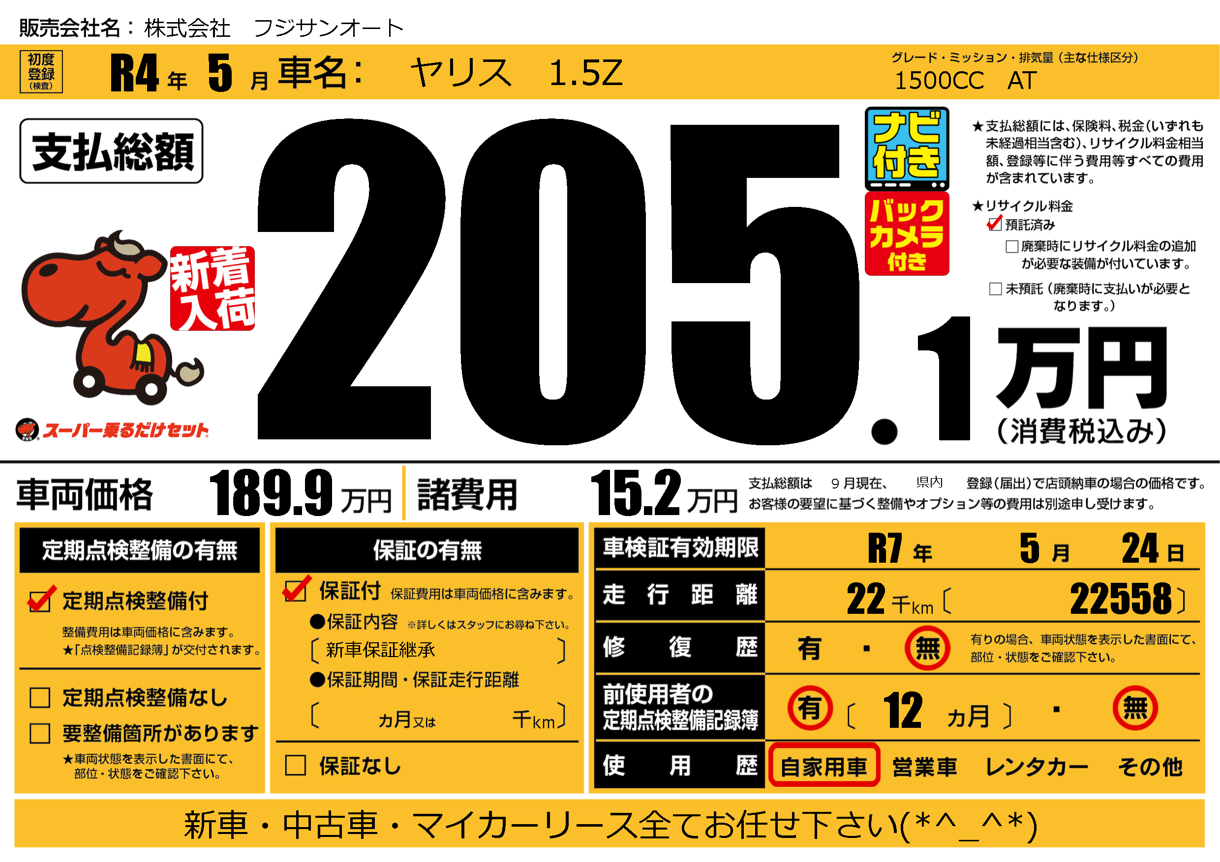 | 車名 | ヤリス 1.5Z | グレード ミッション 排気量 |