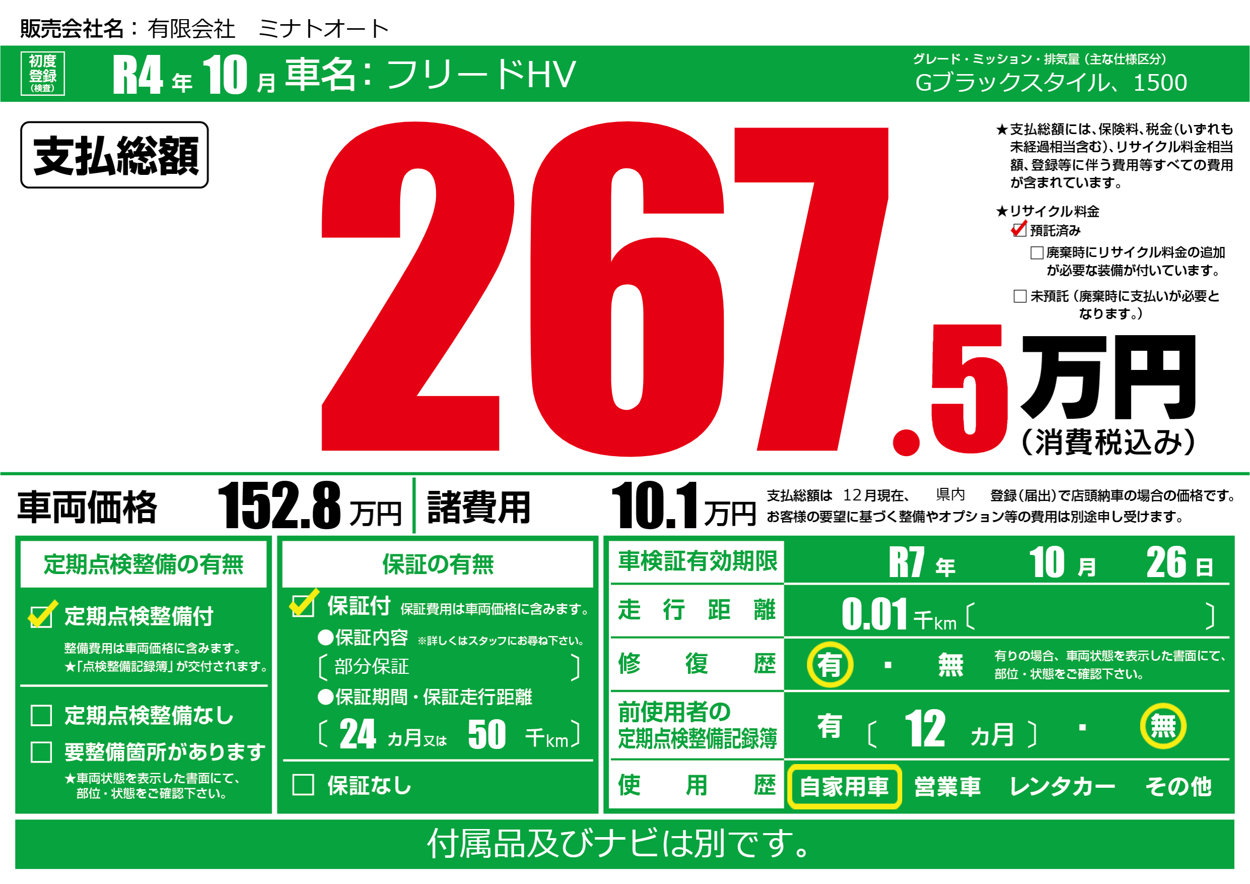 | 車名 | フリードHV | グレード ミッション 排気量 |