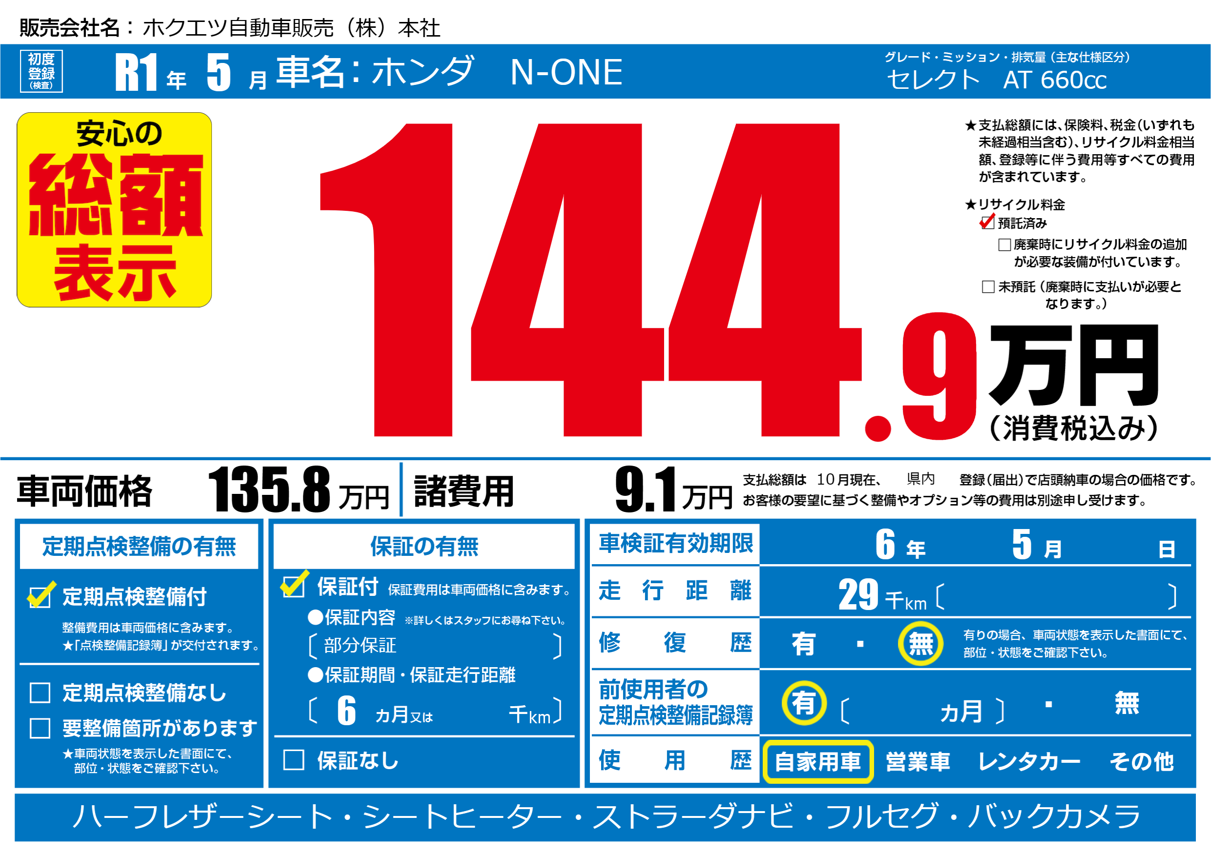 | 車名 | ホンダ N-ONE | グレード ミッション 排気量 |