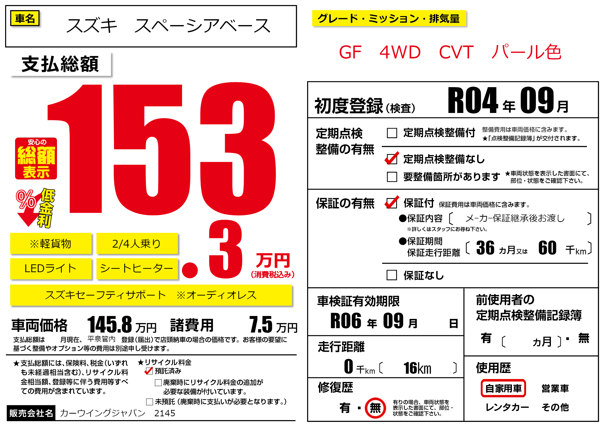| 車名 | スズキ スペーシアベース | グレード ミッション 排気量 |