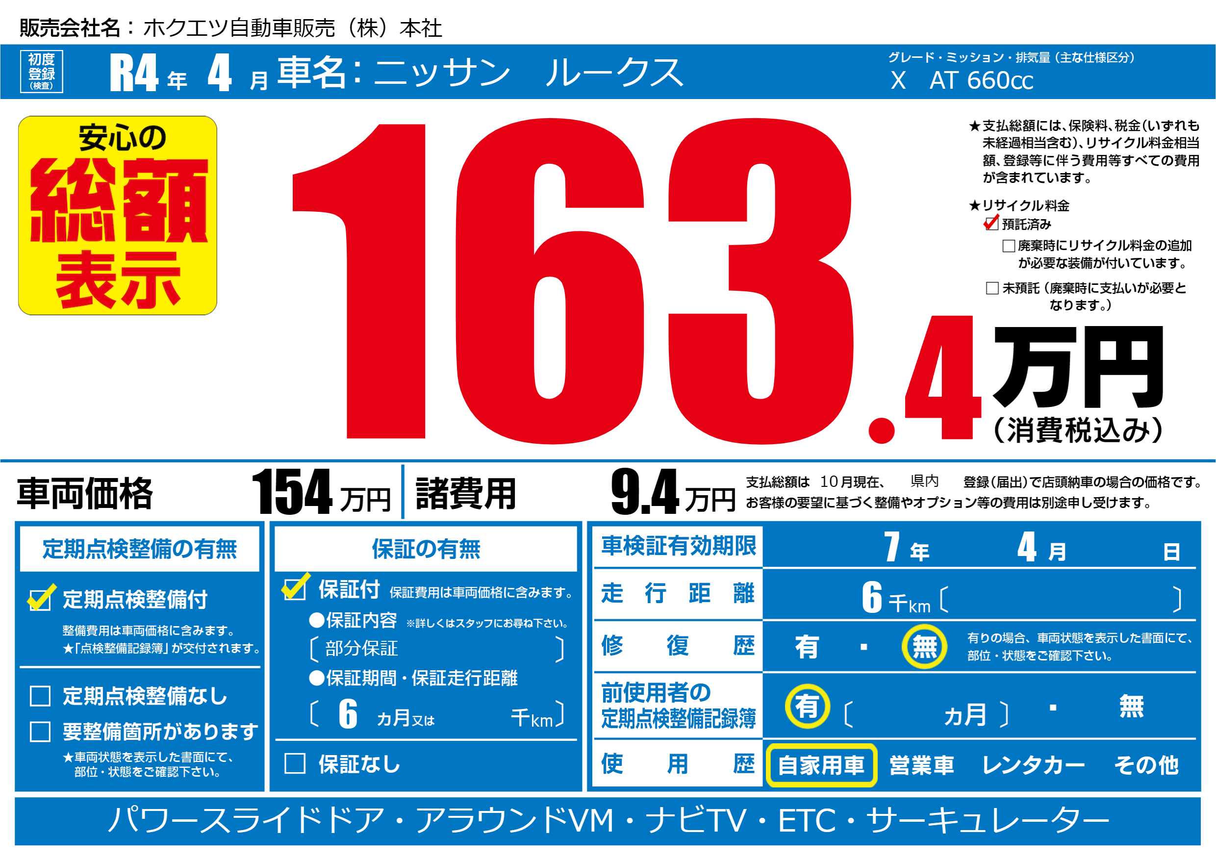 | 走行キロ | 0.6万km | 初年度登録 | R4年4月 |