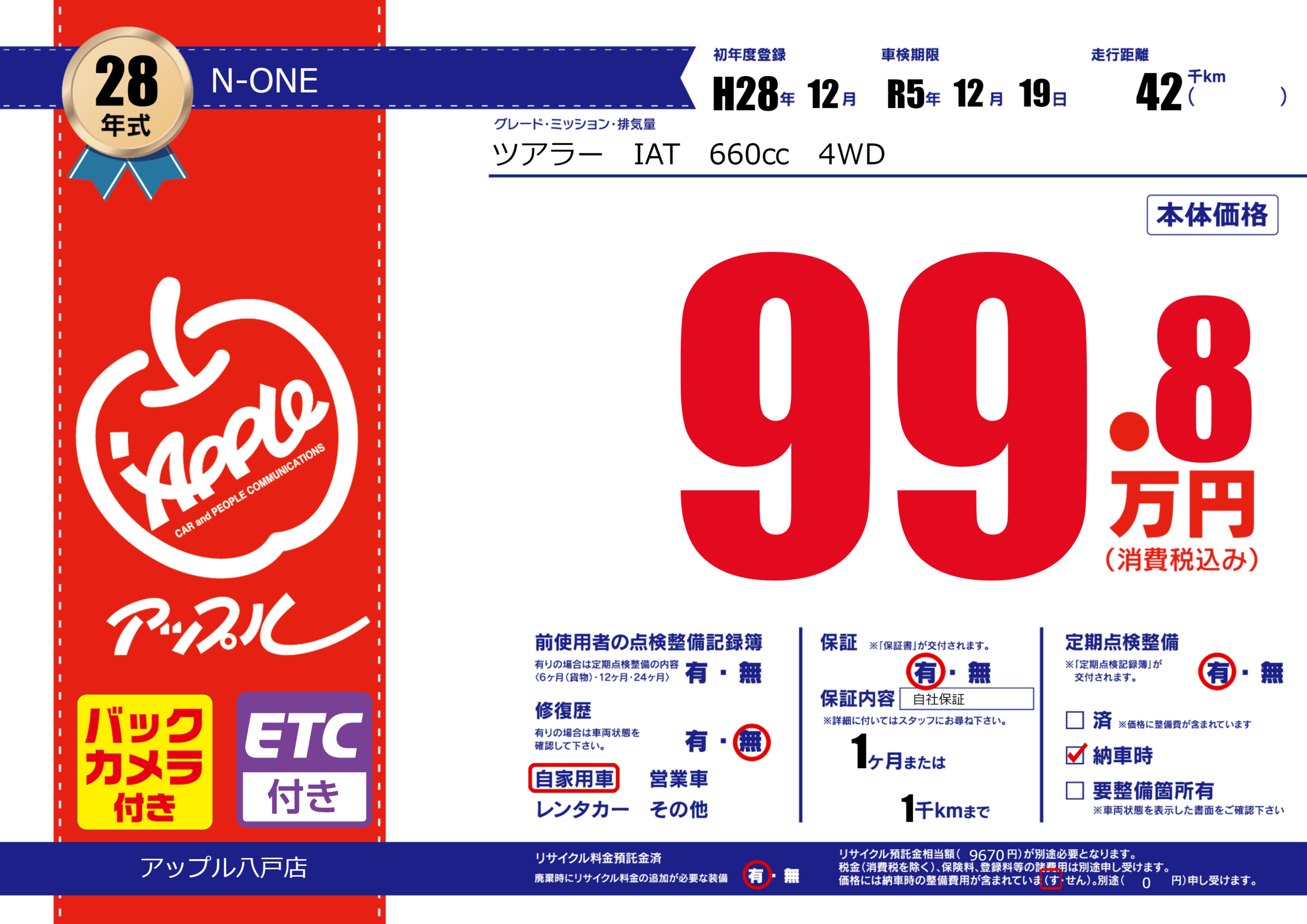 保証付き 保証内容( 自社保証) 1ヶ月または(1)千kmまで |