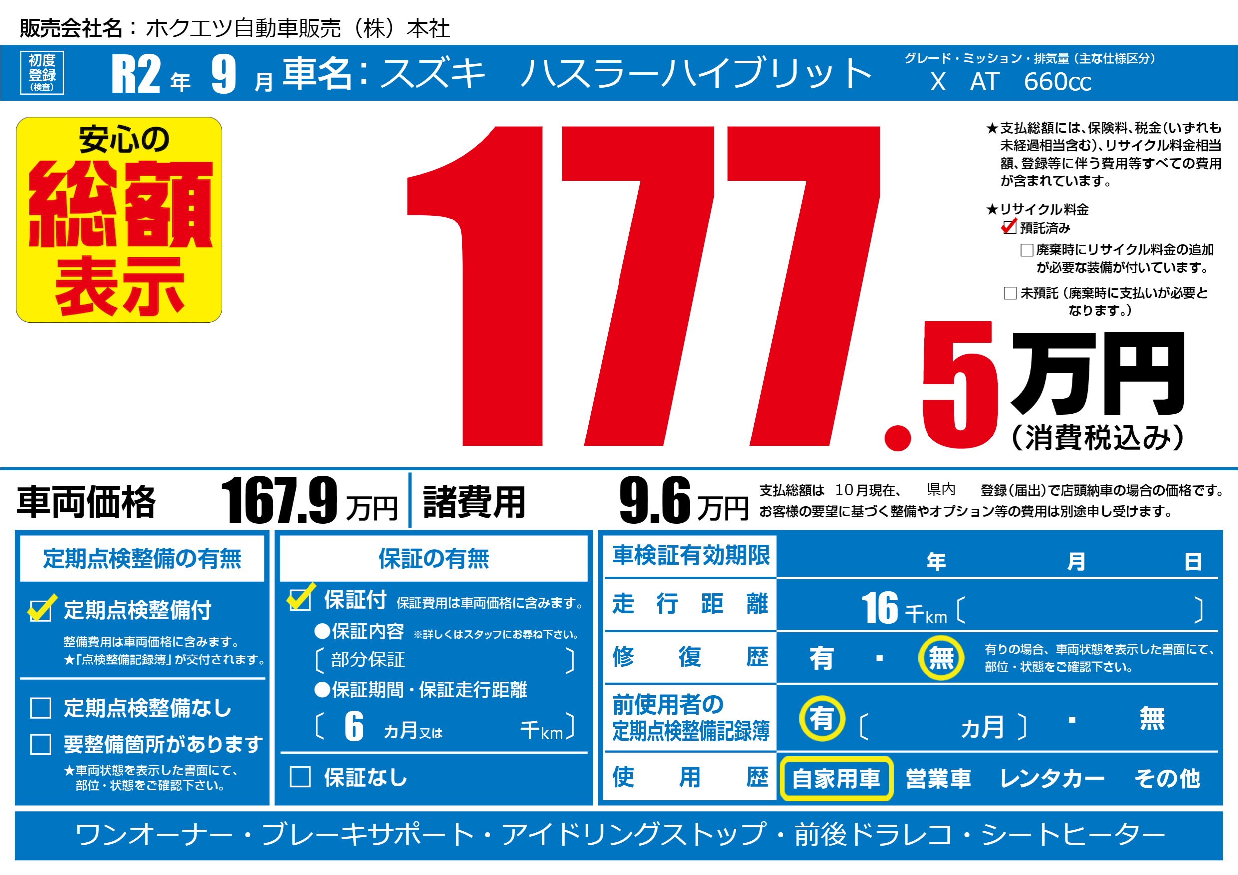 | 車名 | スズキ ハスラーハイブリット | グレード ミッション 排気量 |