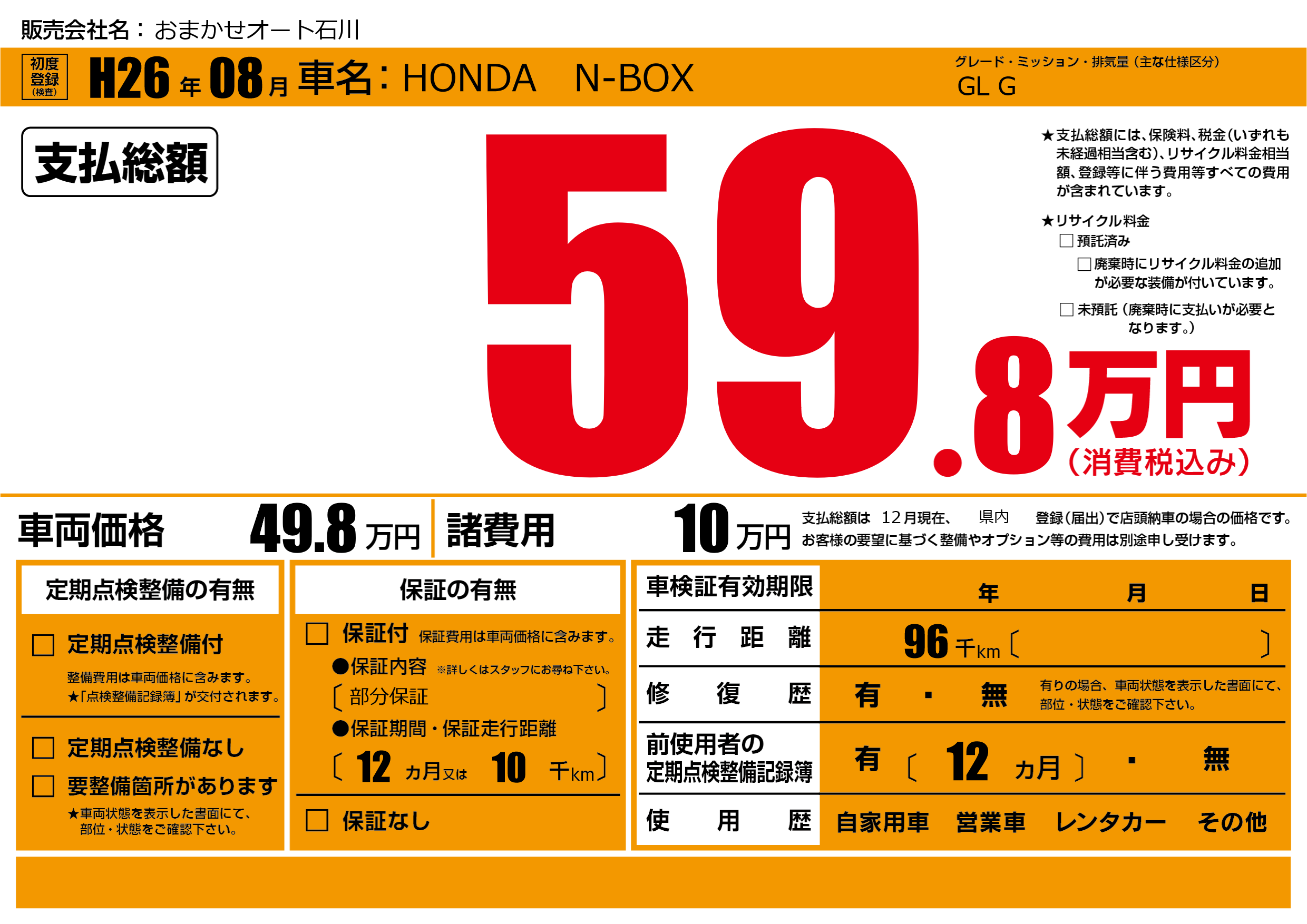 | 車名 | HONDA N-BOX | グレード ミッション 排気量 |