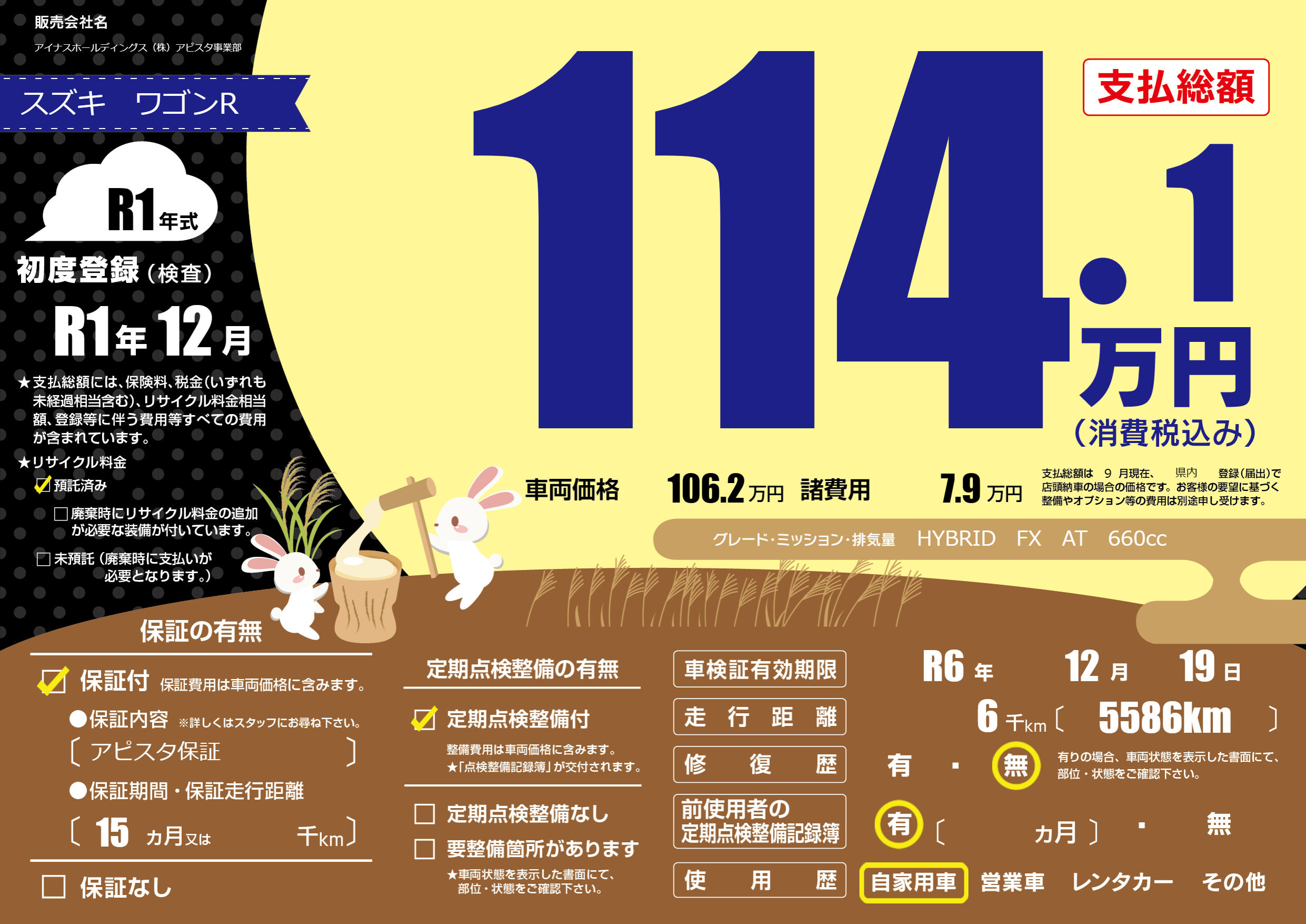 | 車名 | スズキ ワゴンR | グレード ミッション 排気量 |