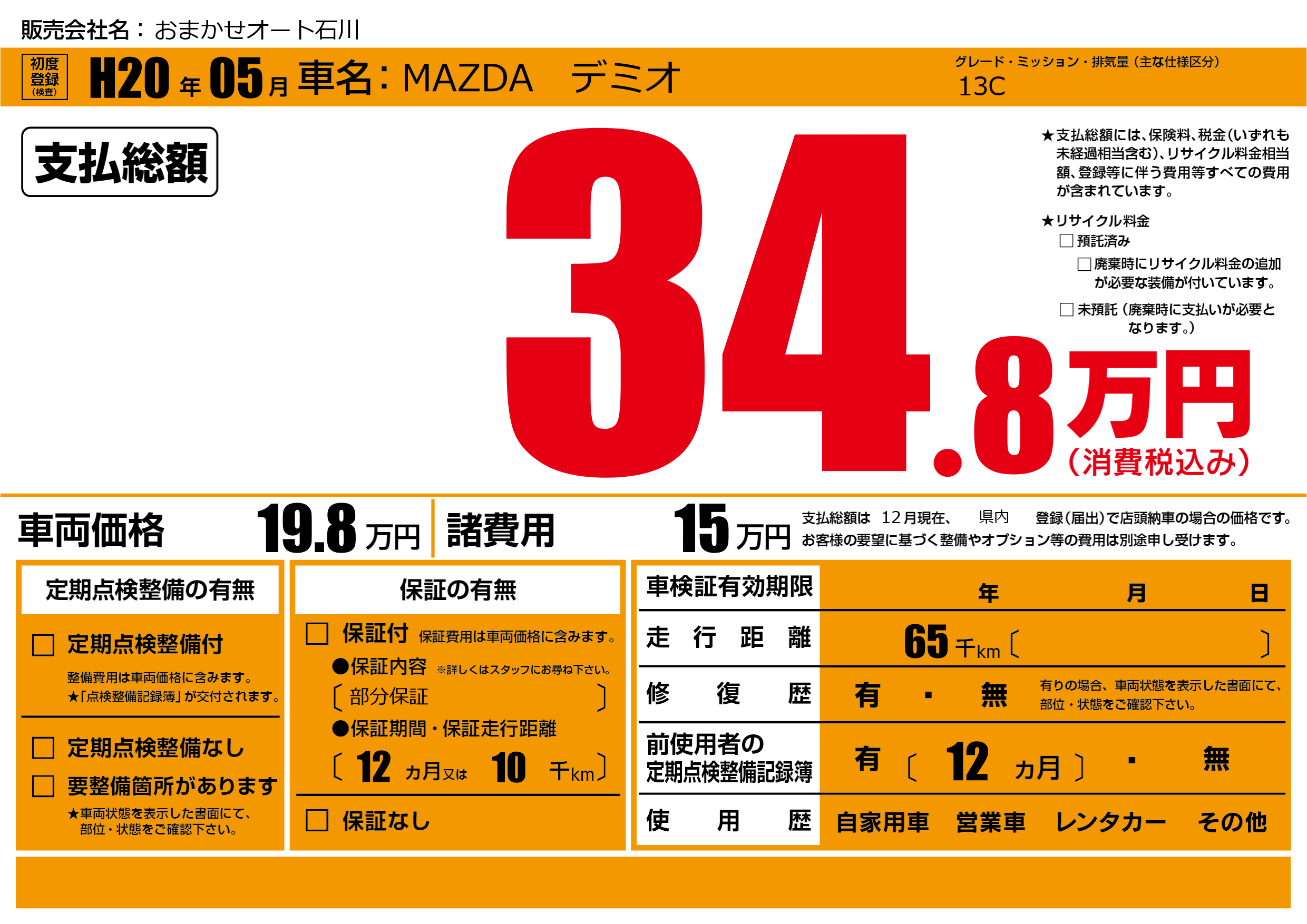 保証なし 保証内容(部分保証) 12ヶ月または(10)千kmまで |