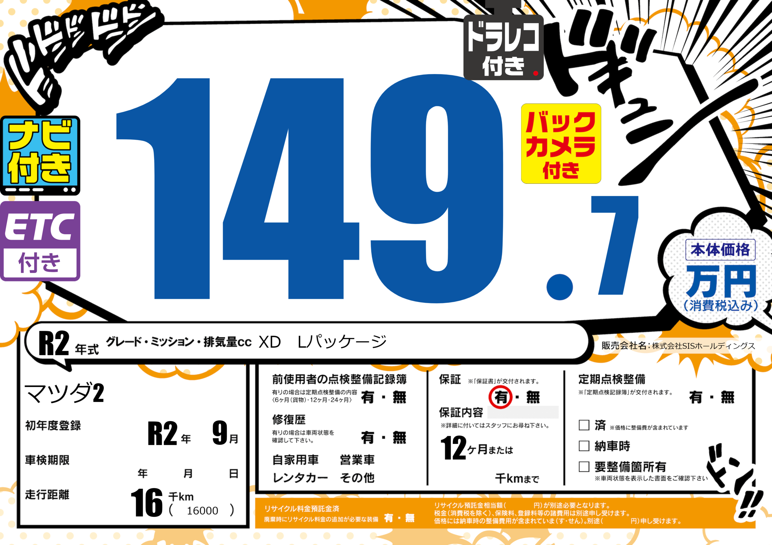 | 走行キロ | 1.6万km | 初年度登録 | R2年9月 |