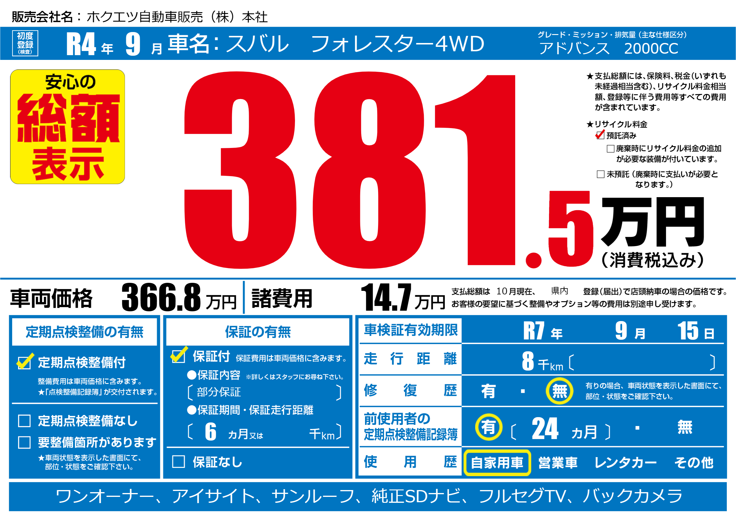 | 走行キロ | 0.8万km | 初年度登録 | R4年9月 |