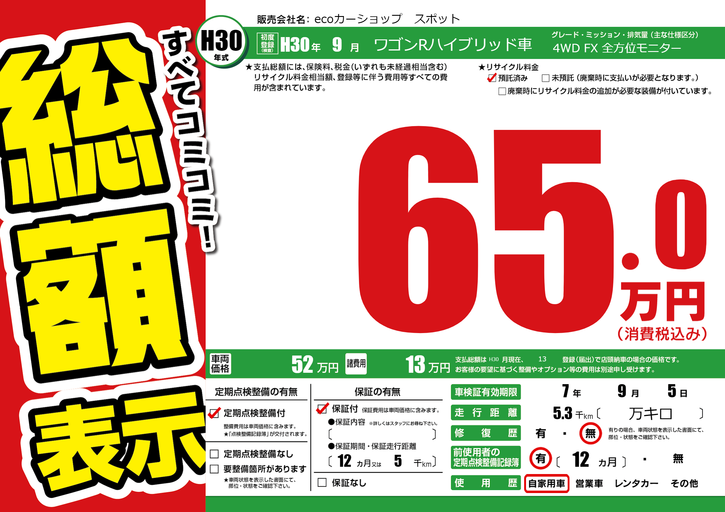 | 車名 | ワゴンRハイブリッド車 | グレード ミッション 排気量 |