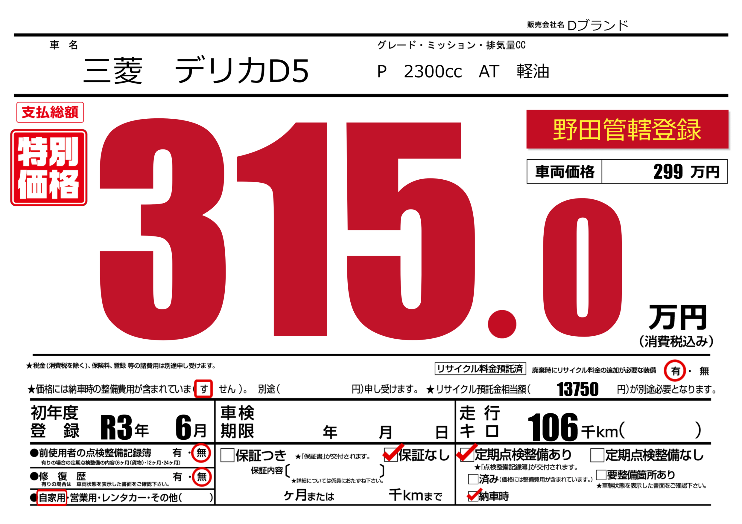 | 車名 | 三菱 デリカD5 | グレード ミッション 排気量 |