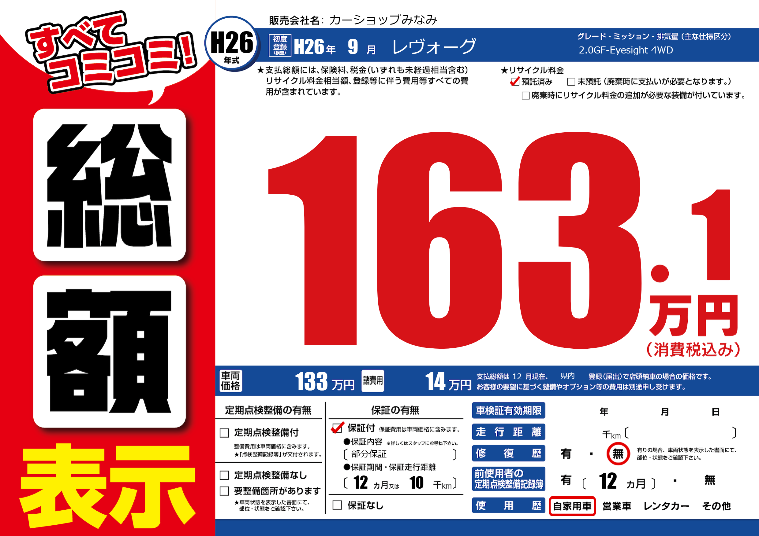 | 車名 | レヴォーグ | グレード ミッション 排気量 |
