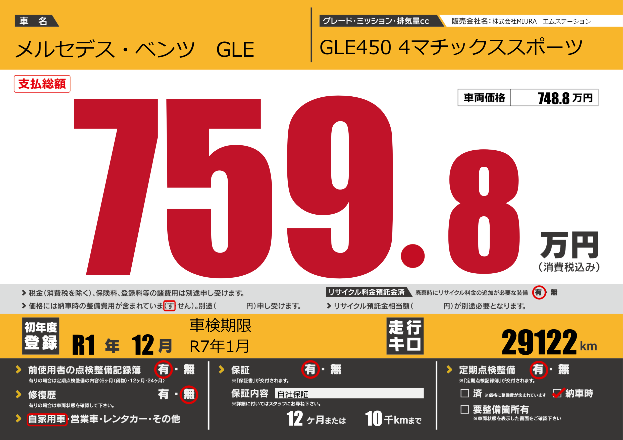 | 車名 | メルセデス・ベンツ GLE | グレード ミッション 排気量 |