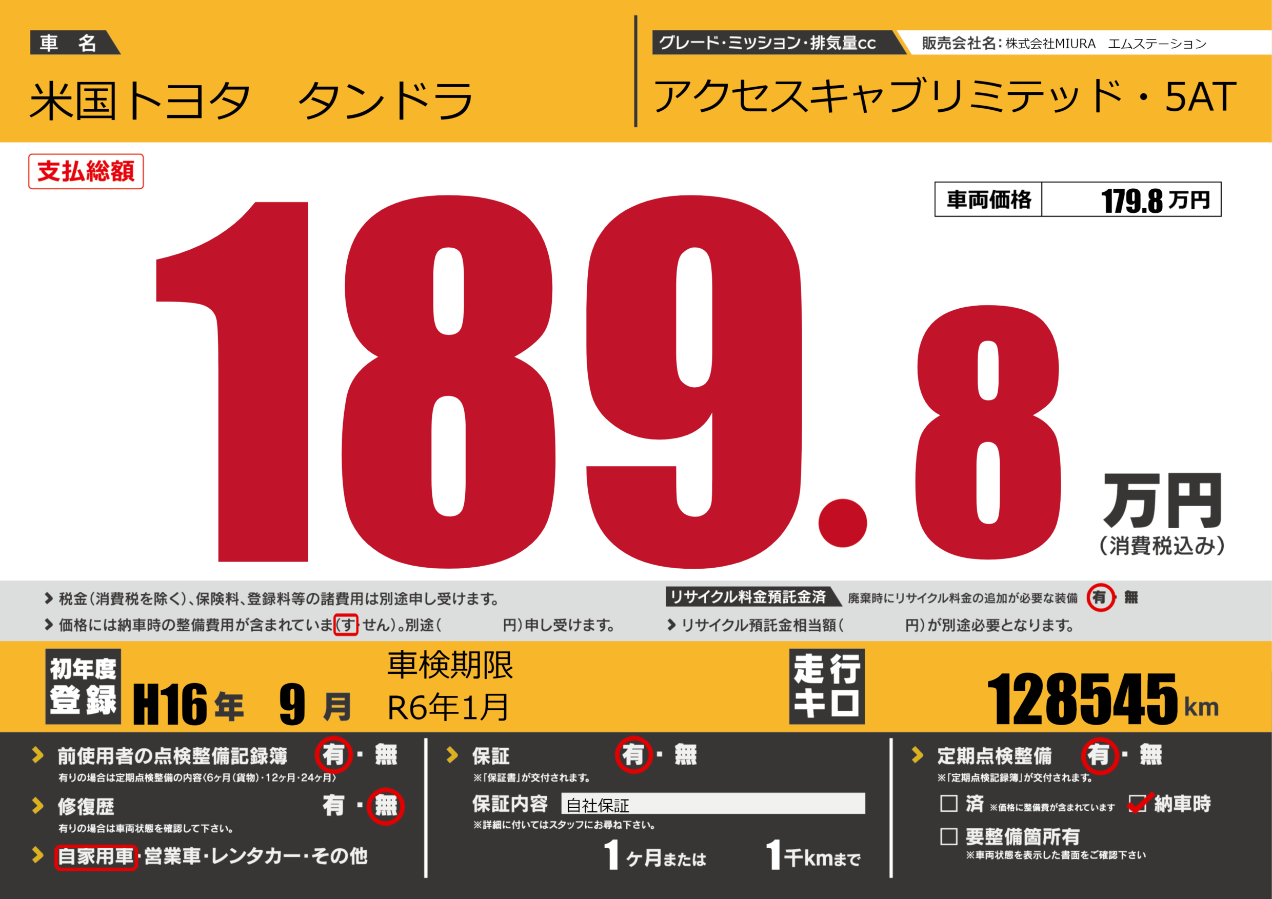 保証付き 保証内容(自社保証) 1ヶ月または(1)千kmまで |