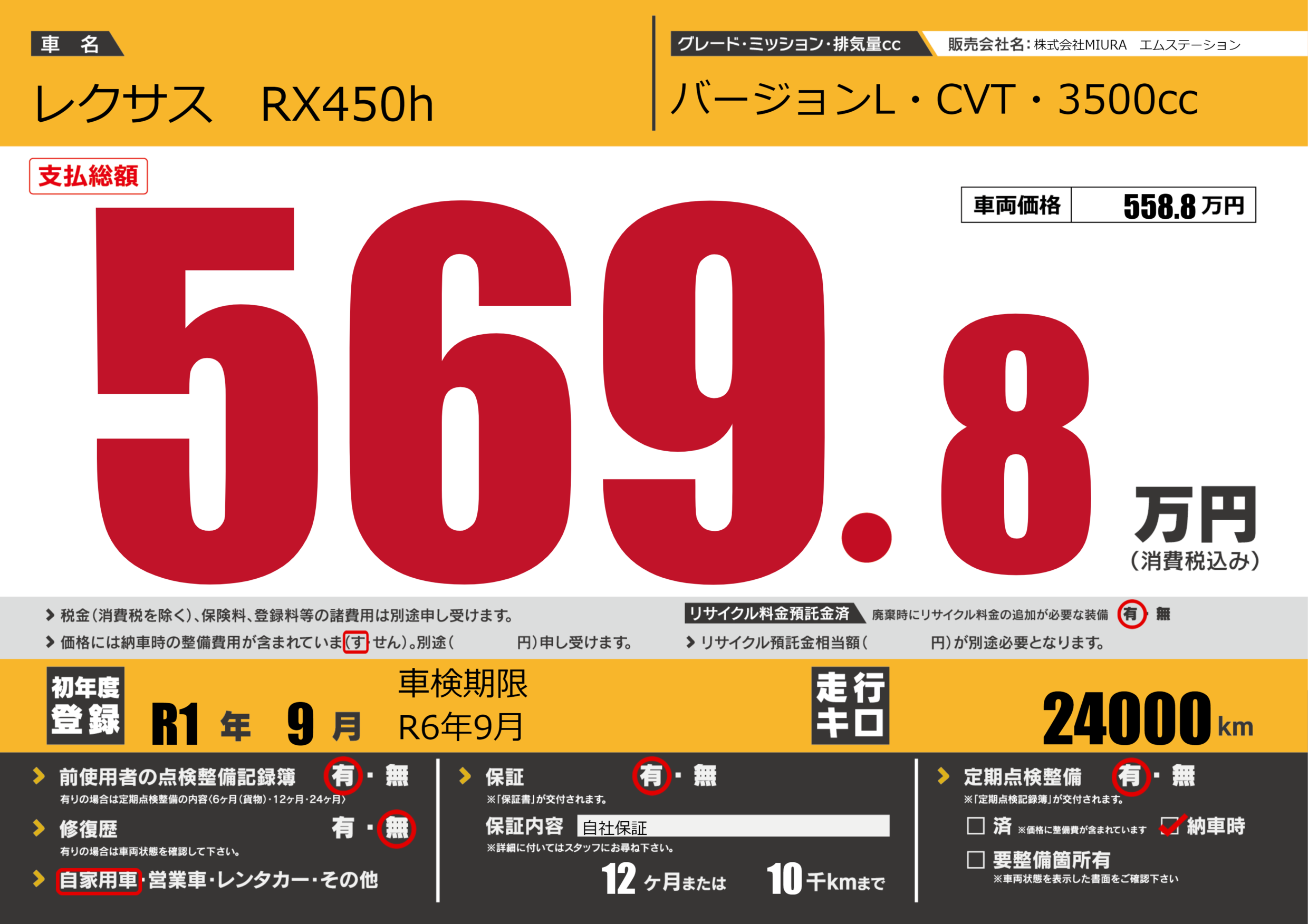 | 車名 | レクサス RX450h | グレード ミッション 排気量 |