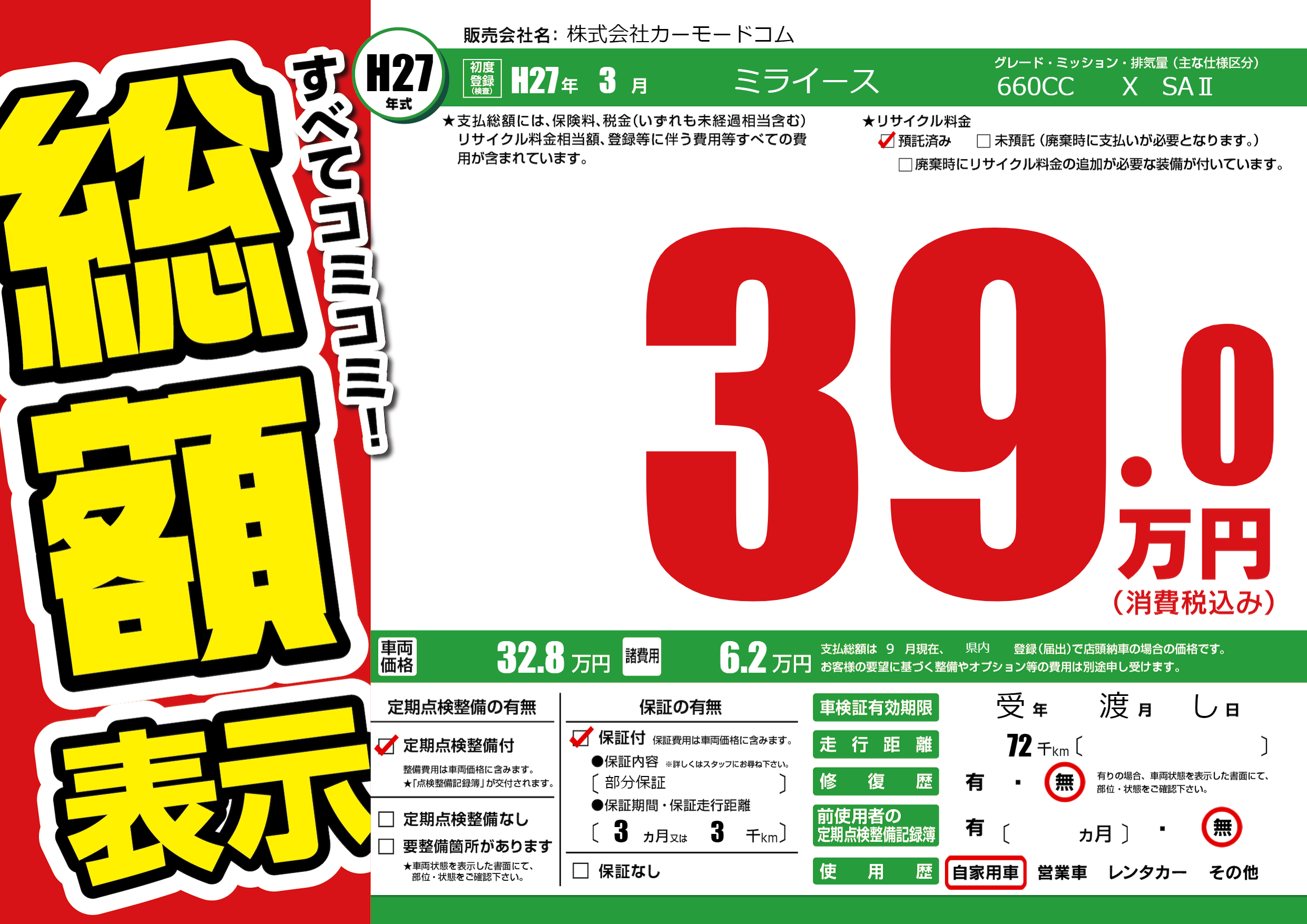 | 車名 | ミライース | グレード ミッション 排気量 |