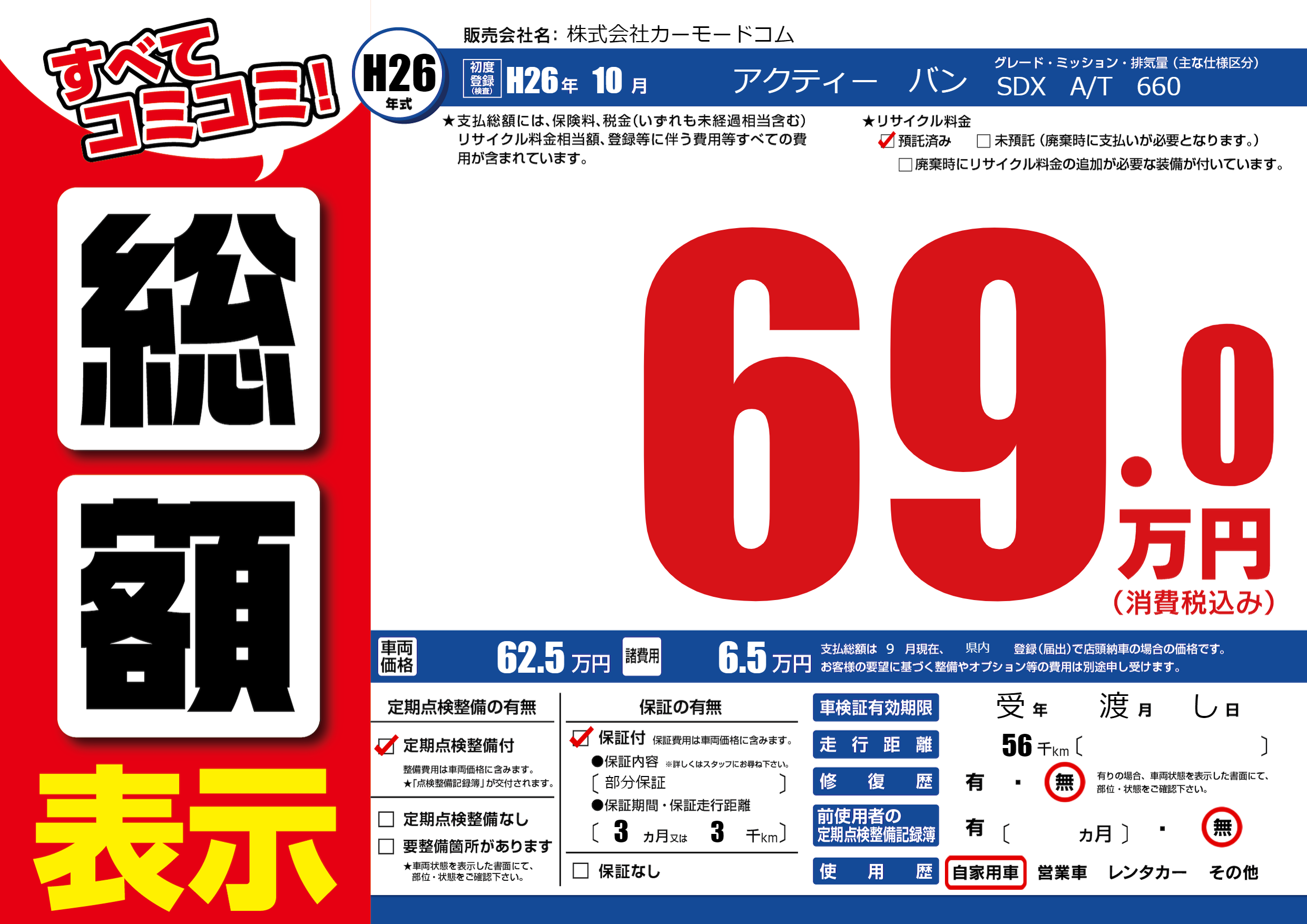 保証付き 保証内容(部分保証) 3ヶ月または(3)千kmまで |