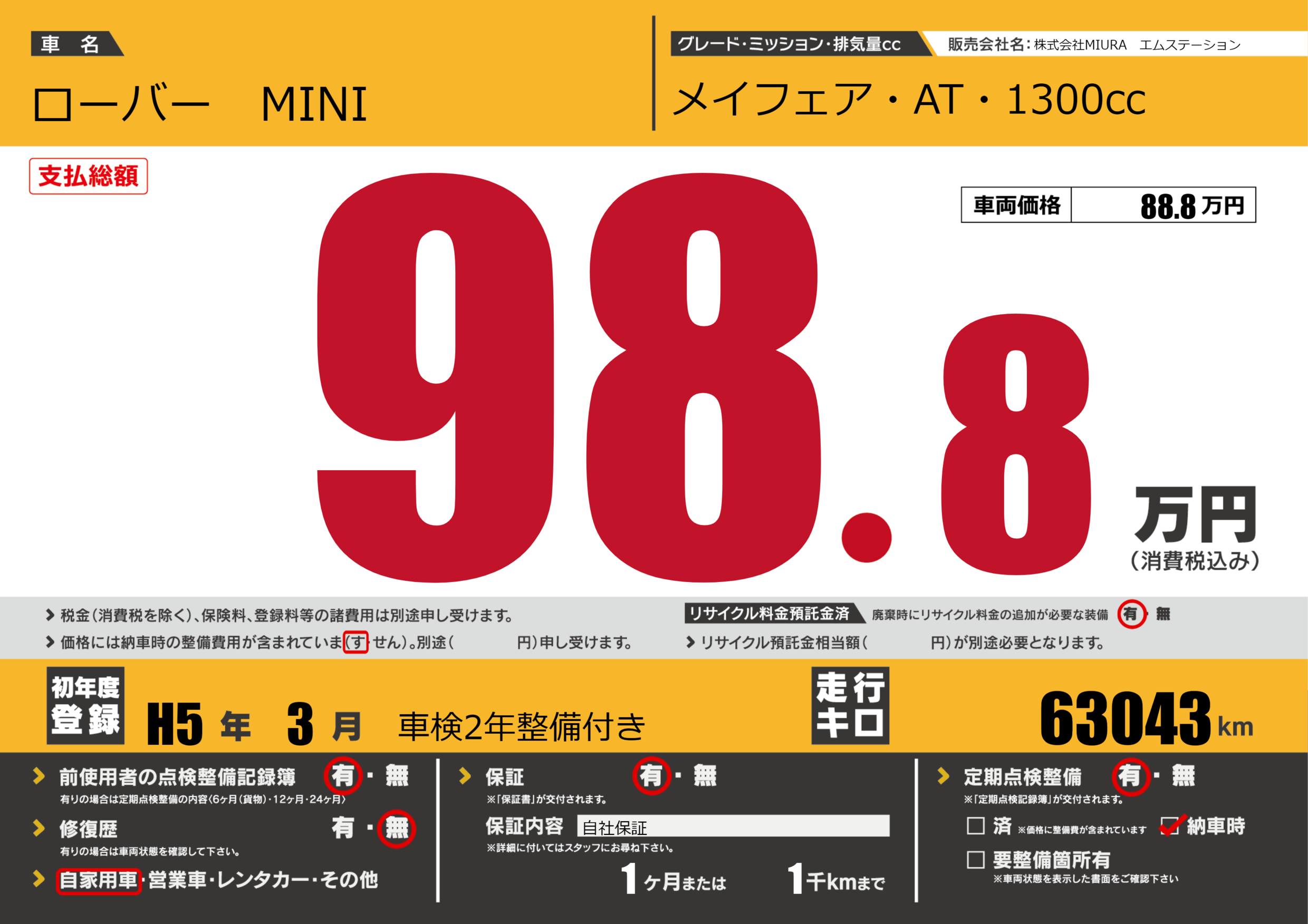 | 車名 | ローバー MINI | グレード ミッション 排気量 |