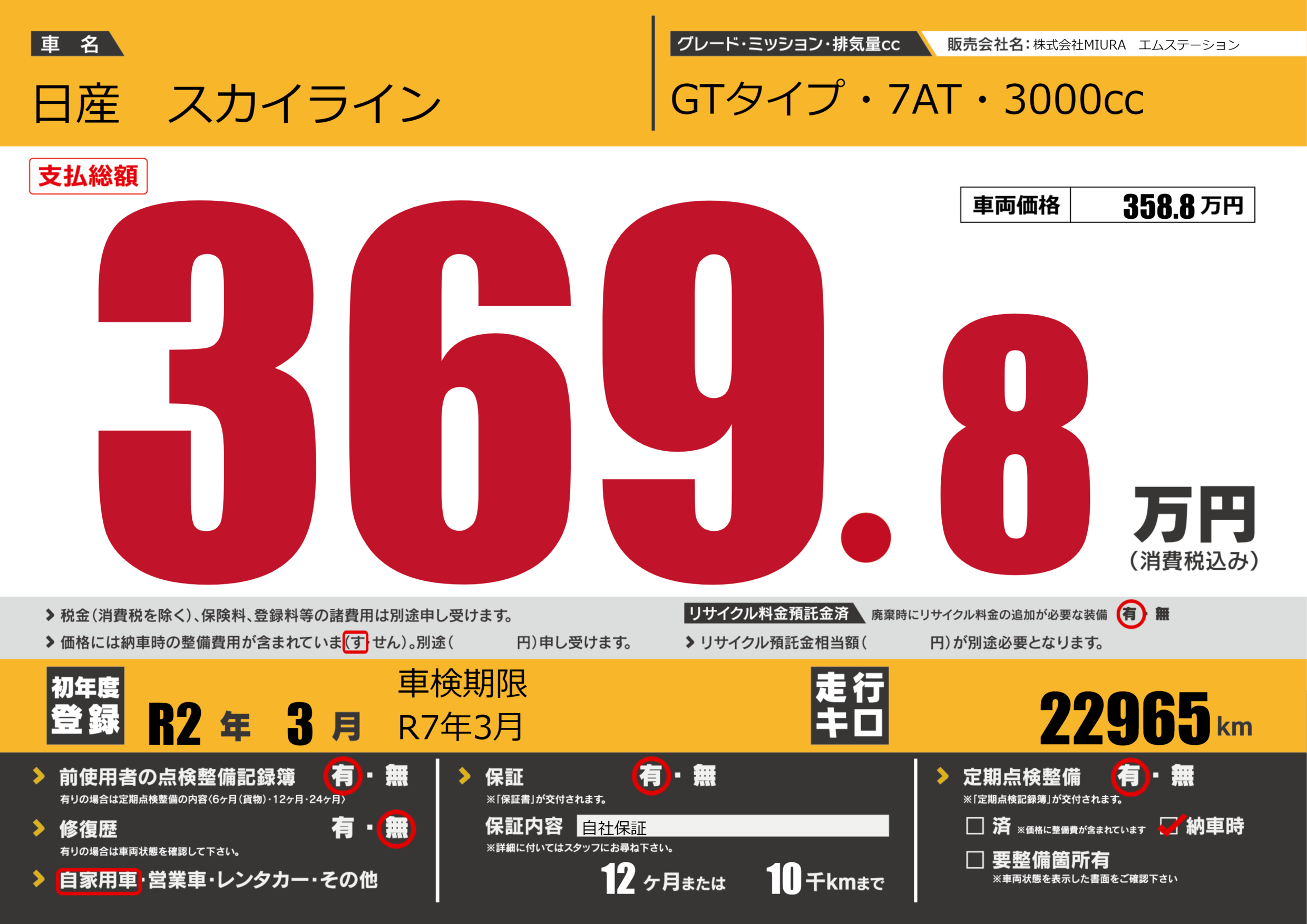 | 車名 | 日産 スカイライン | グレード ミッション 排気量 |